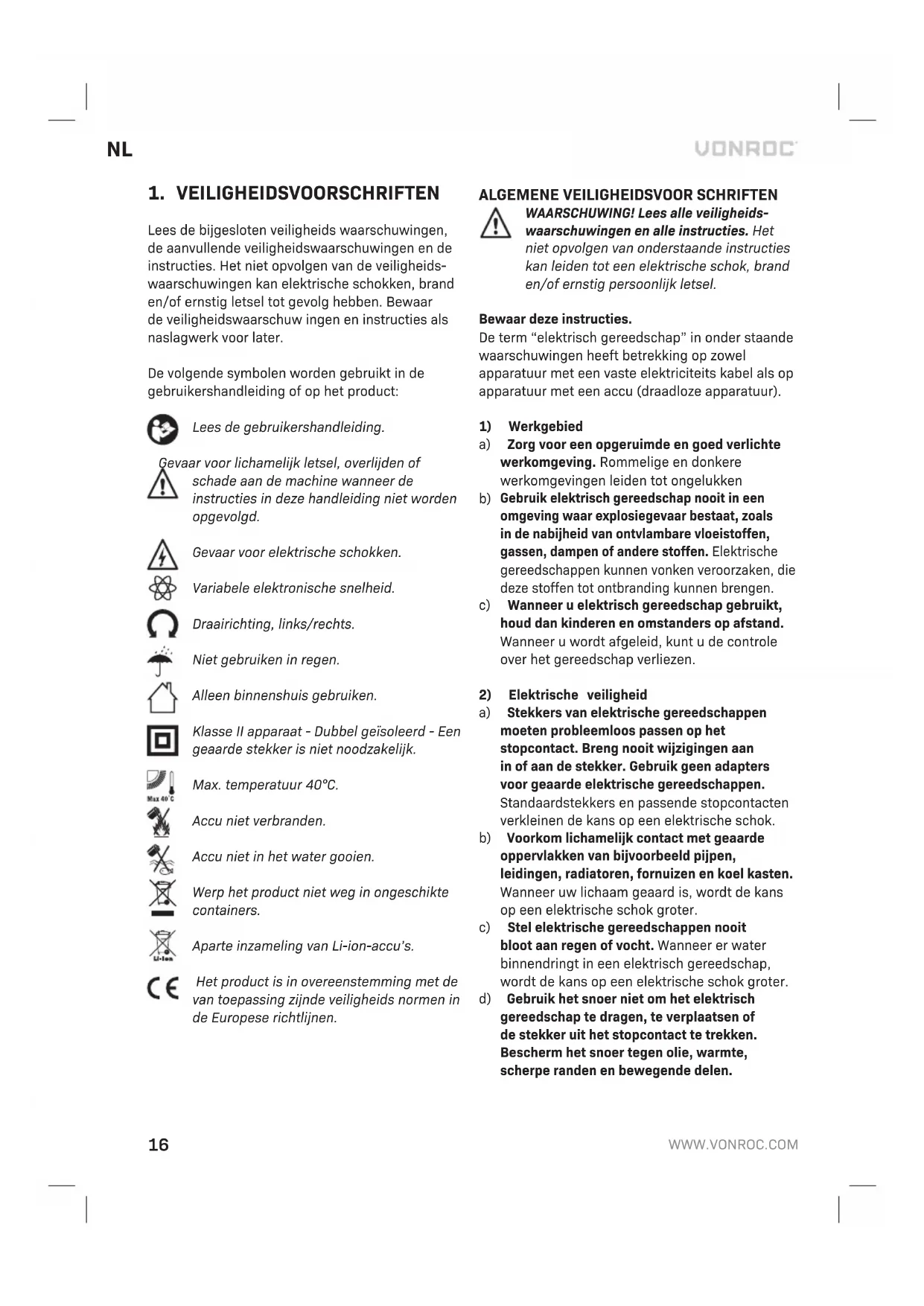 Schakel, voordat u met de reiniging en het onderhoud begint, altijd de machine uit en haal het accupack uit de machine. Reinig de machinebehuizing regelmatig met een zachte doek, bij voorkeur iedere keer na gebruik. Zorg dat de ventilatiesleuven vrij van stof en vuil zijn. Gebruik bij hardnekkig vuil een zachte doek bevochtigd met zeepwater. Gebruik geen oplosmid- delen als benzine, alcohol, ammonia, etc. Dergelij- ke stoffen beschadigen de kunststof onderdelen. MILIEU Defecte en/of afgedankte elektrische of elektronische gereedschappen dienen ter verwerking te worden aangeboden aan een daarvoor verantwoordelijke instantie. Uitsluitend voor EG-landen Werp elektrisch gereedschap niet weg bij het huis- vuil. Conform de Europese Richtlijn 2012/19/EG voor Afgedankte Elektrische en Elektronische Apparatuur en de implementatie ervan in nationaal recht moet niet langer te gebruiken elektrisch gereedschap gescheiden worden verzameld en op een milieuvriendelijke wijze worden verwerkt. GARANTIE VONROC producten zijn ontworpen volgens de hoogste kwaliteitsstandaarden en gegarandeerd vrij van defecten, zowel materieel als fabrieksfou- ten, tijdens de wettelijk vastgestelde garantiepe-22