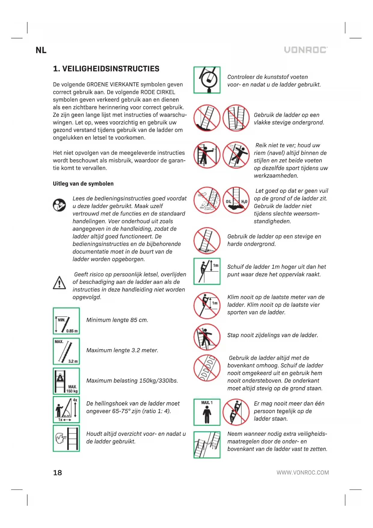 De volgende GROENE VIERKANTE symbolen geven correct gebruik aan. De volgende RODE CIRKEL symbolen geven verkeerd gebruik aan en dienen als een zichtbare herinnering voor correct gebruik. Ze zijn geen lange lijst met instructies of waarschu- wingen. Let op, wees voorzichtig en gebruik uw gezond verstand tijdens gebruik van de ladder om ongelukken en letsel te voorkomen. Het niet opvolgen van de meegeleverde instructies wordt beschouwt als misbruik, waardoor de garan- tie komt te vervallen. Uitleg van de symbolen Lees de bedieningsinstructies goed voordat u deze ladder gebruikt. Maak uzelf vertrouwd met de functies en de standaard handelingen. Voer onderhoud uit zoals aangegeven in de handleiding, zodat de ladder altijd goed functioneert. De bedieningsinstructies en de bijbehorende documentatie moet in de buurt van de ladder worden opgeborgen. Geeft risico op persoonlijk letsel, overlijden of beschadiging aan de ladder aan als de instructies in deze handleiding niet worden opgevolgd.