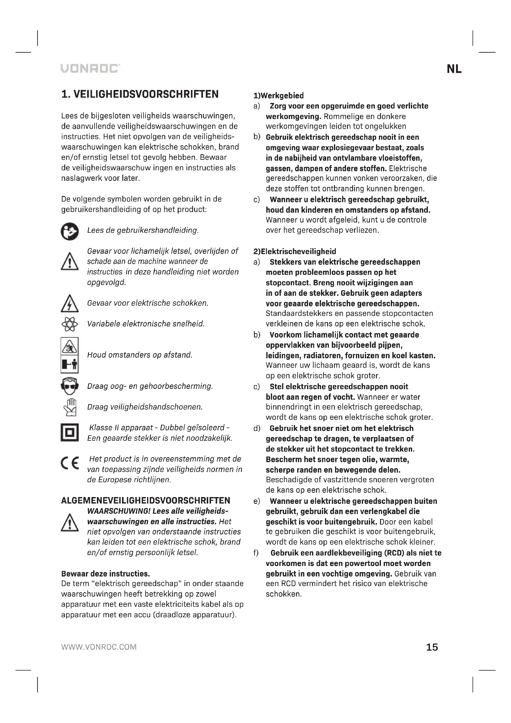 Schakel voor reiniging en onderhoud altijd de machine uit en verwijder de netstekker uit het stopcontact. Reinig de machinebehuizing regelmatig met een zachte doek, bij voorkeur iedere keer na gebruik. Zorg dat de ventilatiesleuven vrij van stof en vuil zijn. Gebruik bij hardnekkig vuil een zachte doek bevochtigd met zeepwater. Gebruik geen oplosmid- delen als benzine, alcohol, ammonia, etc. Dergelij- ke stoffen beschadigen de kunststof onderdelen. MILIEU Defecte en/of afgedankte elektrische of elektronische gereedschappen dienen ter verwerking te worden aangeboden aan een daarvoor verantwoordelijke instantie. Uitsluitend voor EG-landen Werp elektrisch gereedschap niet weg bij het huisvuil. Conform de Europese Richtlijn 2012/19/ EG voor Afgedankte Elektrische en Elektronische Apparatuur en de implementatie ervan in nationaal recht moet niet langer te gebruiken elektrisch gereedschap gescheiden worden verzameld en op een milieuvriendelijke wijze worden verwerkt. GARANTIE VONROC producten zijn ontworpen volgens de hoogste kwaliteitsstandaarden en gegarandeerd vrij van defecten, zowel materieel als fabrieksfouten, tijdens de wettelijk vastgestelde garantieperiode vanaf de eerste aankoopdatum. Mocht het product tijdens deze periode gebreken vertonen veroorzaakt door defecte materialen en/of fabrieksfouten, neem dan rechtstreeks contact op met VONROC. De volgende situaties vallen niet onder de garantie: