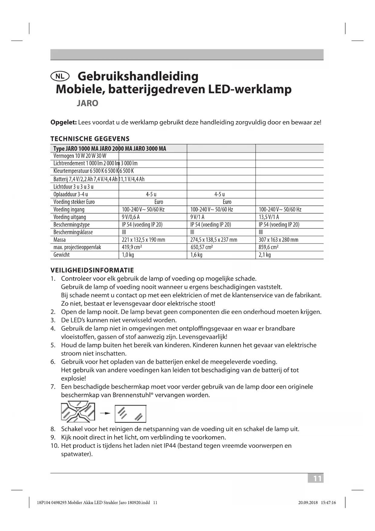 ONDERHOUD De lichtbron van deze werklamp kan niet worden vervangen. Wanneer de levensduur van de lichtbron vervallen is, moet de volledige werklamp worden vervangen. REINIGING Gebruik geen oplosmiddelen, bijtende reinigingsmiddelen of gelijksoortige middelen. Gebruik voor het schoonmaken van de lamp alleen een droge of licht bevochtigde doek. AFVOER AFVAL Elektrische apparaten milieuvriendelijk afvoeren! Elektrische apparaten behoren niet bij het huisvuil! Volgens Europese Richtlijn 2012/19/EU betreende elektrische en elektronische apparatuur moeten afgedankte elektrische apparaten gescheiden worden ingezameld en naar een milieuvriendelijk recyclebedrijf afgevoerd worden. Over mogelijkheden voor het afvoeren van afgedankte apparaten kunt u informatie vragen bij uw gemeente of stadsbestuur. Niet-correct afgevoerde batterijen en accu’s zijn schadelijk voor het milieu! Batterijen en accu’s horen niet bij het huisvuil. Ze kunnen namelijk zware metalen bevatten en moeten als gevaarlijk afval worden behandeld. Breng daarom lege batterijen en accu’s naar uw gemeentelijk inzamelpunt. CONFORMITEITSVERKLARING De conformiteitsverklaring is beschikbaar bij de fabrikant. Adressen Hugo Brennenstuhl GmbH & Co. KG Seestraße 1 – 3 · D-72074 Tübingen H. Brennenstuhl S.A.S. 4 rue de Bruxelles · F-67170 Bernolsheim lectra-t ag Blegistrasse 13 · CH-6340 Baar www.brennenstuhl.com 18P104 0498293 Mobiler Akku LED Strahler Jaro 180920.indd 13 20.09.2018 15:47:1714 J Istruzioni per l’uso Faretto a batteria portatile JARO Attenzione: si prega di leggere attentamente le presenti istruzioni per l’uso prima di utilizzare il faretto e di conservarle con cura! DATI TECNICI Modello JARO 1000 MA JARO 2000 MA JARO 3000 MA Potenza 10 W 20 W 30 WEcienza luminosa 1 000 lm 2 000 lm 3 000 lmTemperatura cromatica 6 500 K 6 500 K 6 500 KBatteria 7,4 V/2,2 Ah 7,4 V/4,4 Ah 11,1 V/4,4 AhAutonomia 3 h 3 h 3 hDurata di carica 3-4 h 4-5 h 4-5 h Alimentatore spina Euro Euro Euro Alimentatore ingresso 100-240 V~ 50/60 Hz 100-240 V~ 50/60 Hz 100-240 V~ 50/60 Hz Alimentatore uscita 9 V/0,6 A 9 V/1 A 13,5 V/1 A Tipo di protezione IP 54 (alimentatore IP 20) IP 54 (alimentatore IP 20) IP 54 (alimentatore IP 20) Classe di protezione III III III Massa 221 x 132,5 x 190 mm 274,5 x 138,5 x 237 mm 307 x 163 x 280 mm Supercie di proiezione massima 419,9 cm 650,57 cm 859,6 cm Peso 1,0 kg 1,6 kg 2,1 kg