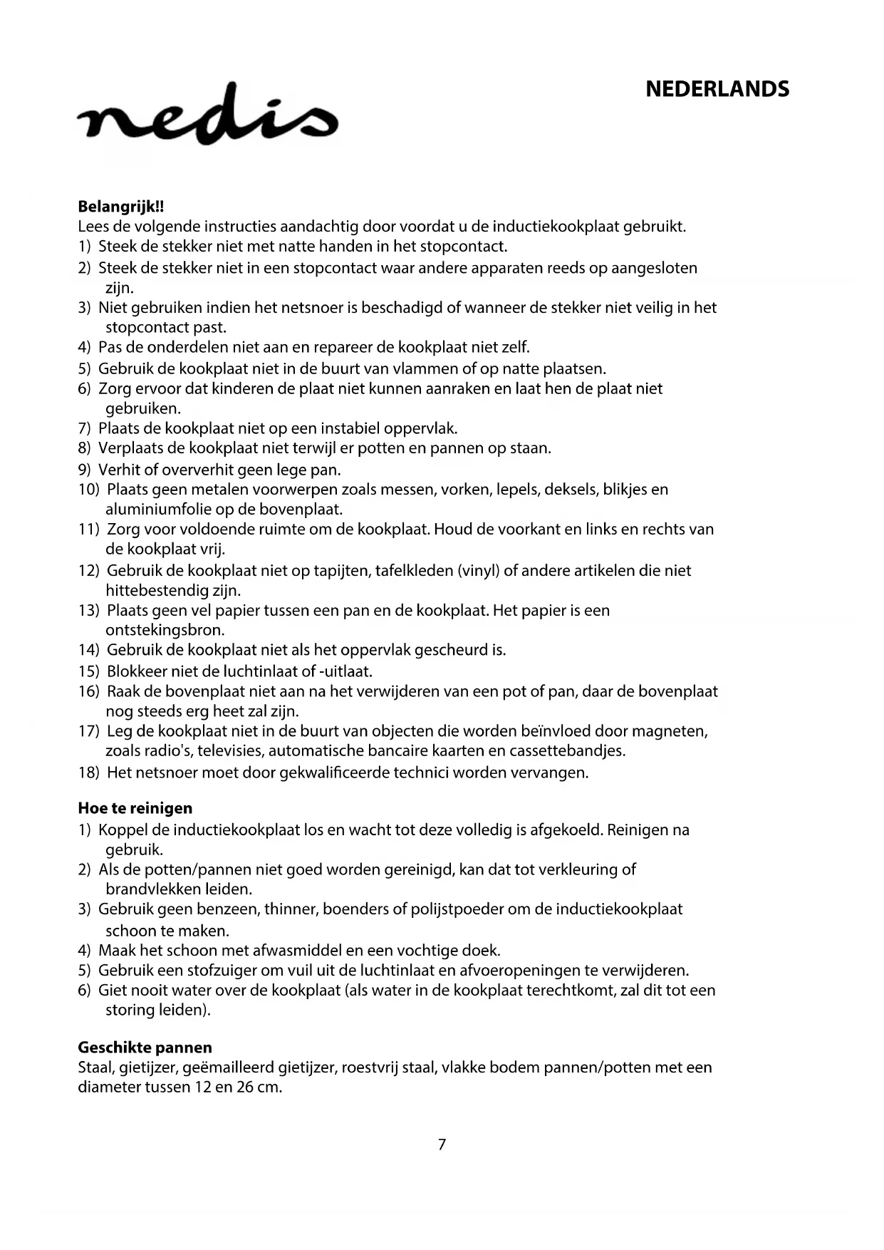NIET OPENEN Veiligheidsmaatregelen: Om het risico op elektrische schokken te voorkomen mag dit product ALLEEN worden geopend door een erkende technicus wanneer er onderhoud nodig is. Koppel het product los van de elektrische voeding en van andere apparatuur als er zich problemen voordoen. Stel het product niet bloot aan water of vocht. Onderhoud: Uitsluitend reinigen met een droge doek. Gebruik geen reinigingsmiddelen of schuurmiddelen. Garantie: Voor wijzigingen en veranderingen aan het product of schade veroorzaakt door een verkeerd gebruik van dit product, kan geen aansprakelijkheid worden geaccepteerd. Tevens vervalt daardoor de garantie. Algemeen: Ontwerpen en specicaties kunnen zonder kennisgeving worden gewijzigd. Alle logo’s, merken en productnamen zijn handelsmerken of geregistreerde handelsmerken van de respectievelijke eigenaren en worden hierbij als zodanig erkend. Bewaar deze gebruiksaanwijzing voor latere raadpleging. Opgelet: Dit product is voorzien van dit symbool. Dit symbool geeft aan dat afgedankte elektrische en elektronische producten niet met het gewone huisafval verwijderd mogen worden. Voor dit soort producten zijn er speciale inzamelingspunten. Dit product is vervaardigd en geleverd in overeenstemming met de relevante reglementen en richtlijnen die voor alle lidstaten van de Europese Unie gelden. Het voldoet ook aan alle toepasselijke specicaties en reglementen van het land van verkoop. Op aanvraag is ociële documentatie verkrijgbaar. Inclusief, maar niet uitsluitend: Conformiteitsverklaring (en productidentiteit), materiaalveiligheidsinformatie en producttestrapport. Wend u tot onze klantenservice voor ondersteuning: via de website: http://www.nedis.nl/nl-nl/contact/contact-formulier.htm via e-mail: service@nedis.nl telefonisch: +31 (0)73-5991055 (tijdens kantooruren) NEDIS B.V., De Tweeling 28, 5215 MC ’s-Hertogenbosch, NEDERLAND12 DEUTSCH Wichtig! Bitte lesen Sie sich die folgenden Anweisungen sorgfältig durch, bevor Sie die Induktionskochplatte benutzen.