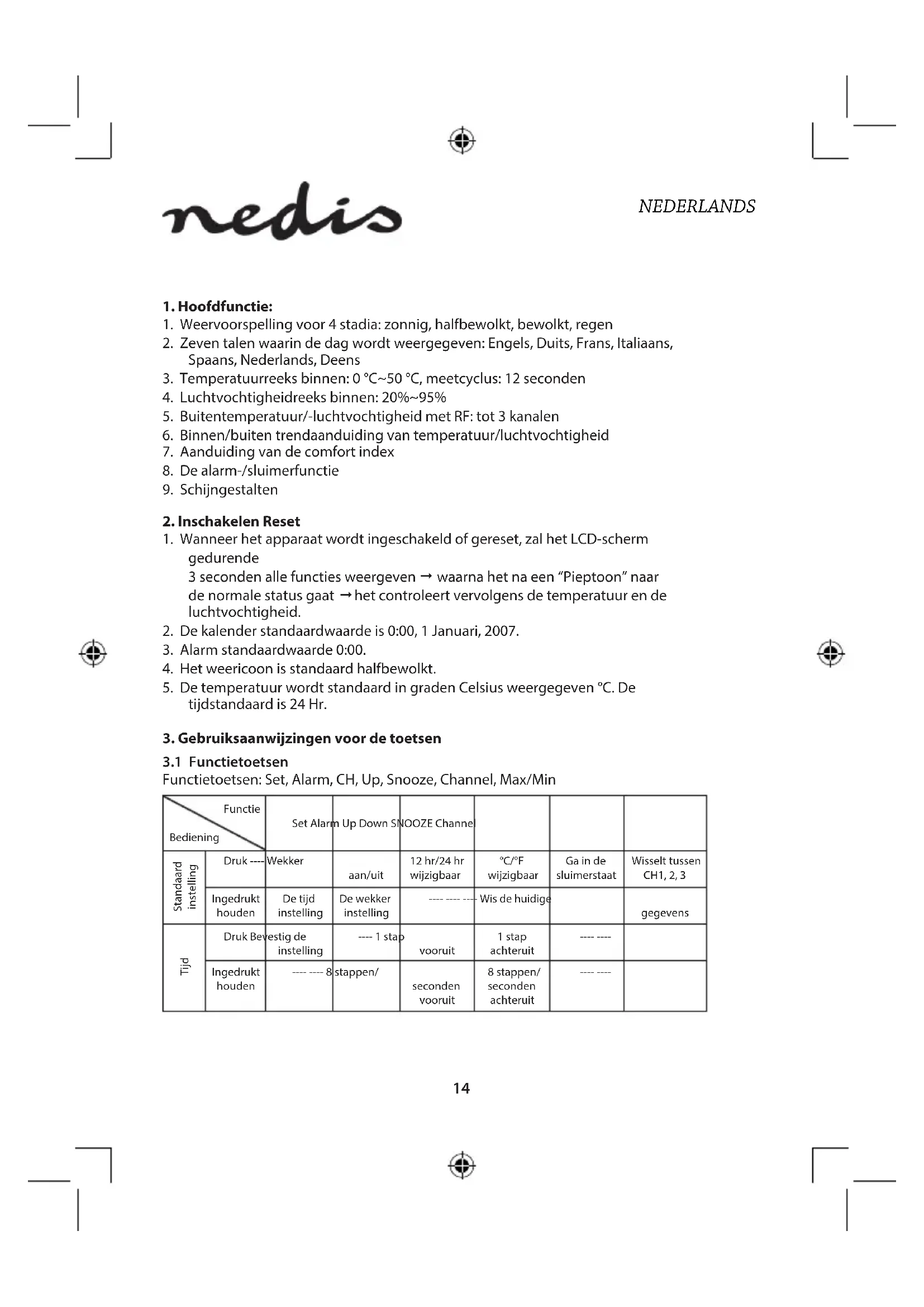 Functietoetsen: Set, Alarm, CH, Up, Snooze, Channel, Max/Min Functie Bediening Set Alarm Up Down SNOOZE Channel Standaard instelling Druk ---- Wekker aan/uit 12 hr/24 hr wijzigbaar °C/°F wijzigbaar Ga in de sluimerstaat Wisselt tussen CH1, 2, 3 Ingedrukt houden De tijd instelling De wekker instelling ---- ---- ---- Wis de huidige gegevens Tijd Druk Bevestig de instelling ---- 1 stap vooruit 1 stap achteruit