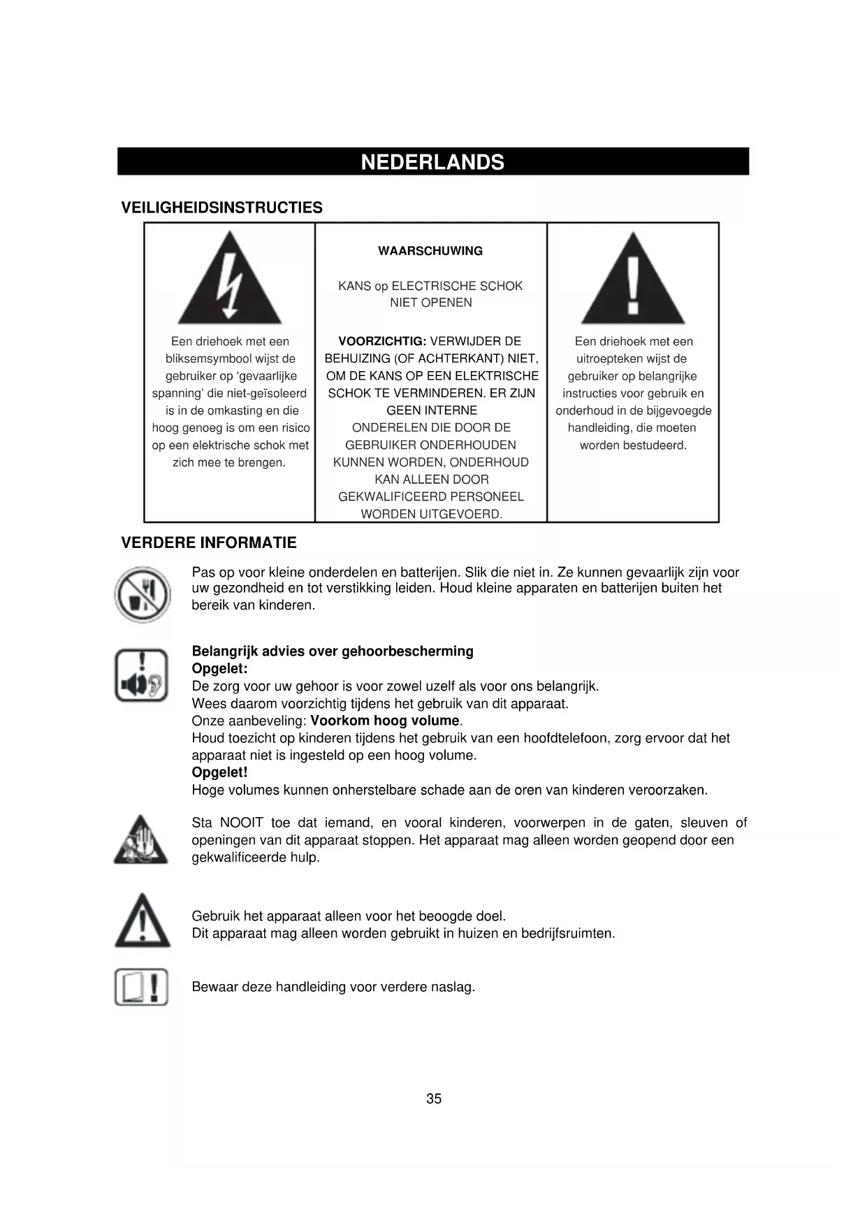 Belangrijk advies over gehoorbescherming Opgelet: De zorg voor uw gehoor is voor zowel uzelf als voor ons belangrijk. Wees daarom voorzichtig tijdens het gebruik van dit apparaat. Onze aanbeveling: Voorkom hoog volume. Houd toezicht op kinderen tijdens het gebruik van een hoofdtelefoon, zorg ervoor dat het apparaat niet is ingesteld op een hoog volume. Opgelet! Hoge volumes kunnen onherstelbare schade aan de oren van kinderen veroorzaken.