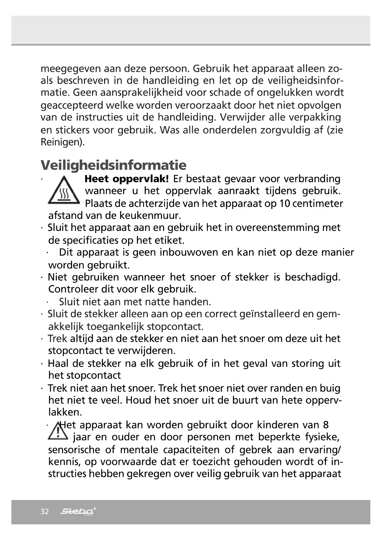 + of + Voor het grillen van gevogelte, rollades, etc. Stel de maximale temperatuur in. Plaats de bakplaat in het laagste inschuifniveau zodat vet kan afdruipen. Vetrijk voedsel kan spatten. Bevestig een draaispit-vork aan het spit. Plaats het gebonden vlees of gevogelte aan het spit en fixeer deze met de tweede draaispit-vork. Zorg ervoor dat het vlees in het midden van de draaispit geplaatst is. Plaats het spit met het vlees op de spituitnemer en steek de punt van het spit in de motor opening in de rechter binnenzijde van de oven. Plaats daarna de andere kant van het spit op de spithouder aan de linkerzijde. Gebruik de spituitnemer om het klaargemaakte voedsel uit de oven te nemen.38 Correcte afvalverwijdering van dit product Versleten apparaten onmiddellijk onbruikbaar maken. Binnen de Europese Unie duidt dit symbool erop dat dit product niet samen met huishoudelijk afval verwijderd mag worden. Oude apparaten bevatten waardevolle, recycleerbare materialen, die aan recycling onderworpen moeten worden om het milieu c.q. de menselijke gezondheid niet door een ongecontroleerde afvalverwijdering te schaden. Gelieve oude apparaten daarom via geschikte inzamelsystemen te verwijderen of het apparaat met het oog op de afvalverwijdering terug naar de afzender (waar u het product gekocht hebt) te zenden. De afzender zal dan het apparaat aan een stoffelijke recycling onderwerpen. Evacuatie van de verpakking Verpakkingsmateriaal niet gewoon wegwerpen, maar aan recycling onderwerpen. Verpakkingen van papier, karton en gegolfd karton in verzamelcentra voor oud pa- pier afgeven. Onderdelen van kunststofverpakkingen en folie dienen eveneens in de daarvoor bestemde verzamelbakken gedeponeerd te worden. In de voorbeelden voor de kunststofbenaming staat: PE voor polyethyleen, het kencijfer 02 voor PE-HD, 04 voor PE-LD, PP voor polypropyleen, PS voor polystyreen. Klantenserviceafdeling: Indien uw apparaat tegen de verwachting in dan toch al eens de klantenserviceaf- deling nodig heeft, gelieve u dan tot onderstaand adres te richten. Wij zullen dan in geval van garantie voor de afhaling zorgen. Het apparaat moet transporteerbaar verpakt zijn. Ongefrankeerde pakjes kunnen niet aanvaard worden! STEBA Elektrogeräte GmbH & Co KG Pointstr. 2, 96129 Strullendorf / Germany Verkopen-Tel.: 09543 / 449-17 / -18, Service-Tel.: 09543 / 449-44, Fax: 09543 / 449-19 e-Mail: elektro@steba.com Internet: http://www.steba.com Opgelet! Elektrische apparaten mogen uitsluitend door vakkundig geschoolde elek- triciens gerepareerd worden, omdat er door ondeskundige reparaties aanzienlijke gevolgschade kan ontstaan.39