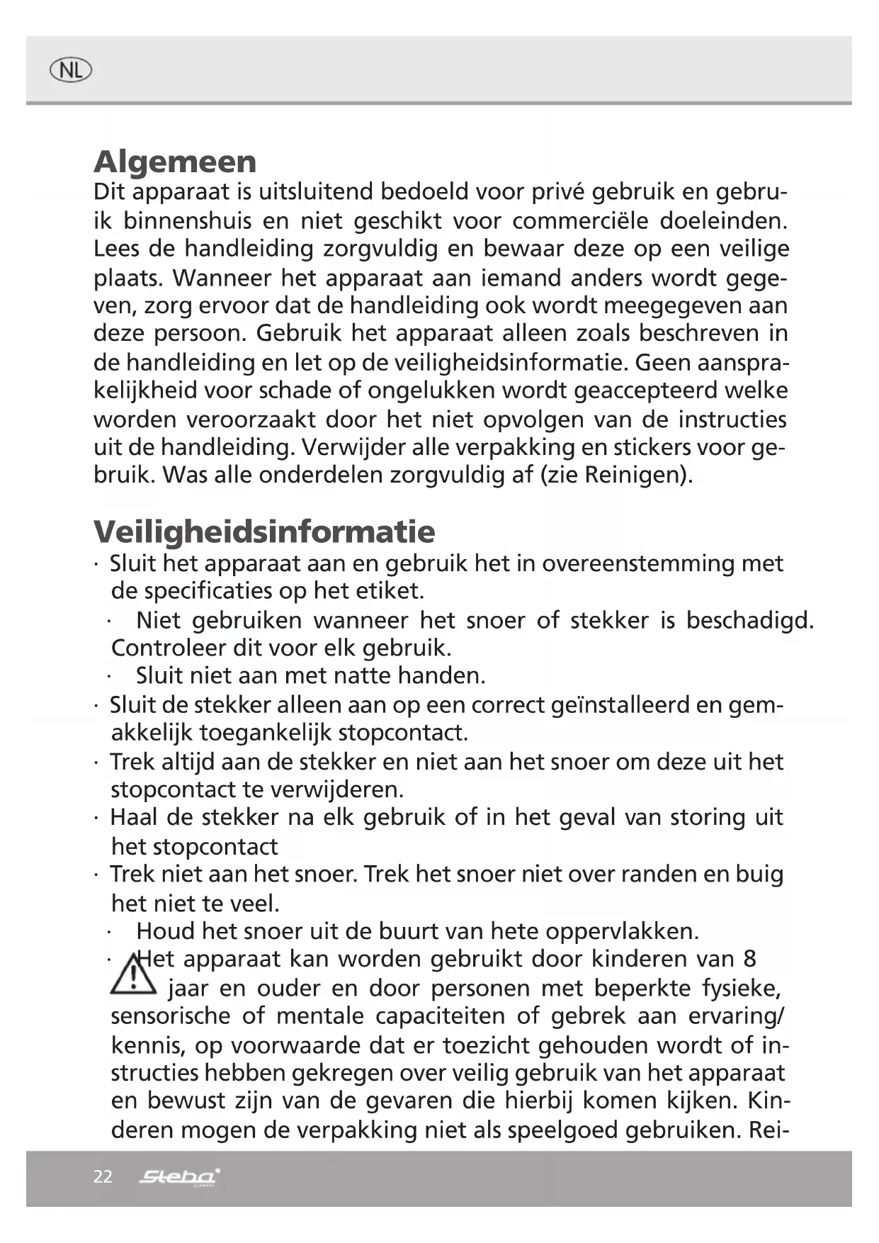 Laat het apparaat niet langer dan 10 minuten aan staan. ∙ Als u zwaar werk met het apparaat uitvoert, kan de behuizing warm worden. Het meeste wordt in seconden gedaan. Maar als de behuizing warmer dan lauw wordt, laat het apparaat dan een paar minuten afkoelen. ∙ Gebruik het apparaat alleen zoals beschreven is in deze hand- leiding. ∙ Dit apparaat is bedoeld om te gebruiken voor huishoudelijk setting, zoals: o personeelskeukens in winkels, kantoren en andere wer- komgevingen24 o door gasten in hotels, motels en andere type woonom- gevingen o bed & breakfast- achtige omgevingen. ∙ Voor het eerste gebruik: reinig alle delen zorgvuldig en laat deze drogen. ∙ Wanneer er een verlengkabel wordt gebruikt, moet deze een doorsnede van 1,5 mm² hebben. ∙ Als een GS-geteste 16 A multi-pin extensie wordt gebruikt, wordt deze met niet meer dan 3680 watt belast wegens brand- gevaar. ∙ Zorg ervoor dat kinderen niet met de kabel kunnen spelen of erover struikelen. ∙ Het apparaat moet altijd worden losgekoppeld van de stroom- voorziening als het niet onder toezicht staat en voor montage, demontage of reiniging. ∙ Hygiëne: Maak altijd het apparaat schoon om bacteriën en schimmelvorming te voorkomen. Schoonmaken ∙ Let op! Verwijder de stekker uit het stopcontact voor het schoonmaken. ∙ Dompel het apparaat nooit in water. ∙ Voedselresten moeten om hygiënische redenen worden ver- wijderd. ∙ De holding cap voor de vruchten helften kan worden ver- wijderd door zachtjes te drukken op de zwarte knop op de pers hefboom. Verwijder alle andere onderdelen, zoals sap kegel, filterelement en lekbak en laat alles in een mild sopje en droog grondig. ∙ Gelieve erop te letten dat de sapkegel binnen in de motoropne- ming evenals de sleuven in het filterelement schoon zijn. ∙ Het motorgedeelte uitsluitend met een vochtig doekje schoon- wrijven.25 Plaatsing Belangrijk: Plaats dit apparaat nooit op of naast hete oppervlakken (bijvoor- beeld hete kachels). Gebruik het alleen op een gelijk, stabiele en hittebestendig oppervlak. Plaats het apparaat niet op de rand van een tafel of werkblad zodat het niet door kinderen kan wor- den aangeraakt, of vallen als u het aanraakt.