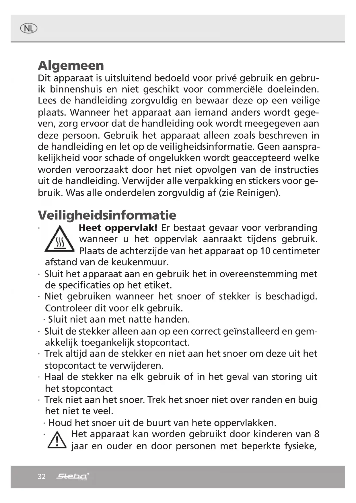 Het apparaat kan worden gebruikt door kinderen van 8 jaar en ouder en door personen met beperkte fysieke,33 sensorische of mentale capaciteiten of gebrek aan ervaring/ kennis, op voorwaarde dat er toezicht gehouden wordt of in- structies hebben gekregen over veilig gebruik van het apparaat en bewust zijn van de gevaren die hierbij komen kijken. Kin- deren mogen de verpakking niet als speelgoed gebruiken. Rei- niging en gebruikersonderhoud mogen niet door kinderen worden uitgevoerd, tenzij ze 8 jaar of ouder zijn en onder toe- zicht staan. ∙ Kinderen onder de 8 jaar moeten uit de buurt van het apparaat en de stroomkabel worden gehouden. ∙ Kinderen moeten onder toezicht staan om ervoor te zorgen dat ze niet met het apparaat of verpakkingsmateriaal spelen (bij- voorbeeld plastic zakken) ∙ Het apparaat mag niet worden bediend met behulp van een externe timer of een afzonderlijk system op afstand. ∙ Laat het apparaat nooit onbeheerd achter tijdens gebruik. ∙ Laat het apparaat niet buiten of in een vochtige ruimte achter. ∙ Dompel het apparaat nooit in water. ∙ Laat een ruimte van ongeveer 10 cm rond het apparaat vrij. ∙ Gebruik het apparaat nooit na een storing, bijvoorbeeld als het gevallen is of op een andere manier beschadigd is geraakt. ∙ De fabrikant is niet aansprakelijk voor de schade die ontstaat door gebruik van het apparaat op een andere manier dan be- schreven, of een fout in het gebruikt. ∙ Om letsel te voorkomen mogen reparaties zoals het vervangen van een beschadigd snoer alleen worden uitgevoerd door een reparatiedienst. Alleen originele onderdelen mogen worden gebruikt. ∙ Het apparaat wordt heet, verplaats deze alleen wanneer hij af- gekoeld is. ∙ Gebruik het apparaat alleen zoals beschreven is in deze hand- leiding. ∙ Plaats geen materialen zoals papier, karton, plastic enz. In het apparaat.34 ∙ Dit apparaat is bedoeld om te gebruiken voor huishoudelijk setting, zoals: o personeelskeukens in winkels, kantoren en andere wer- komgevingen o door gasten in hotels, motels en andere type woonom- gevingen o bed & breakfast- achtige omgevingen. ∙ Voor het eerste gebruik: reinig alle delen – behalve de ver- warmingselementen – zorgvuldig en laat deze drogen. Ver- warm het apparaat gedurende 15 minuten om de geur van ni- euwheid te elimineren. ∙ Let op! Behuizing en glas worden heet. Gevaar voor verbranding! Aanraakbare oppervlakken worden heet tijdens gebruik! Plaats het apparaat op een vlak en on- gevoelig oppervlak en houd een afstand van minimaal 70 cen- timeter tot brandbare materialen. ∙ Tijdens gebruik kan er stoom ontsnappen. Houd handen en ge- zicht weg. Pas op voor stoom tijdens het koken. Neem passende afstand tot keukenkasten om schade aan fineer te voorkomen. ∙ Wanneer er een verlengkabel wordt gebruikt, moet deze een doorsnede van 1,5 mm² hebben. ∙ Als een GS-geteste 16 A multi-pin extensie wordt gebruikt, wordt deze met niet meer dan 3680 watt belast wegens brand- gevaar. ∙ Zorg ervoor dat kinderen niet met de kabel kunnen spelen of erover struikelen. ∙ Het apparaat moet altijd worden losgekoppeld van de stroom- voorziening als het niet onder toezicht staat en voor montage, demontage of reiniging. ∙ Hete stoom kan tussen de platen achterblijven. Plaats nooit nat voedsel in het apparaat, ontdooi bevroren voedsel licht. ∙ Hygiëne: Maak altijd het apparaat schoon om bacteriën en schimmelvorming te voorkomen.35 Reiniging ∙ Let op! Haal de stekker uit het stopcontact voordat u hem schoonmaakt en laat hem eerst afkoelen. ∙ Dompel het apparaat nooit onder in water. ∙ Verwijder de platen van het apparaat en reinig deze alleen met een afwasborstel en een afwasmiddel. Gebruik geen schu- rende schoonmaakmiddelen, verzeepte staalwol of me- talen schrapers, anders zal de antikleefcoating worden beschadigd. ∙ Voor het reinigen van het oppervlak van het apparaat en alle andere onderdelen zoals handgrepen, verstelbare scharnieren, enz., Is een vochtige doek voldoende, mogelijk met een kleine hoeveelheid wasmiddel. Er kan geen garantieclaim worden in- gediend voor snijwonden of krassen op de coating veroorzaakt door gebruik. Plaatsing Belangrijk: Plaats dit apparaat nooit op of naast hete oppervlakken (bijvoor- beeld hete kachels). Gebruik het alleen op een gelijk, stabiele en hittebestendig oppervlak. Het is belangrijk dat er geen ontvlam- bare items zijn in de buurt van het apparaat. Plaats het apparaat niet op de rand van een tafel of werkblad zodat het niet door kinderen kan worden aangeraakt, of vallen als u het aanraakt. Voor het eerste gebruik Vet de grilleerplaten voor het eerste gebruik een keer licht in. Warm vervolgens het apparaat met gesloten grilleerplaten zonder grilleerproducten op de maximale stand 10 minuten op. Wis de platen daarna met een vochtige doek af. Open het apparaat alleen in een hoek van 90 °, anders het scharnier breekt.36 Verwisselen van de platen ∙ Haal de stekker uit het stopcontact. ∙ Laat het apparaat afkoelen. ∙ Druk op de ‘release’ knoppen aan elke zijde en trek vervolgens de platen uit het apparaat. ∙ Bij het verwisselen van de platen passen de twee lipjes op de plaat in de achterste uitsparing, druk de platen in het apparaat totdat u een geluid hoort. Met de meegeleverde sets platen kunt u het apparaat als volgt gebruiken: