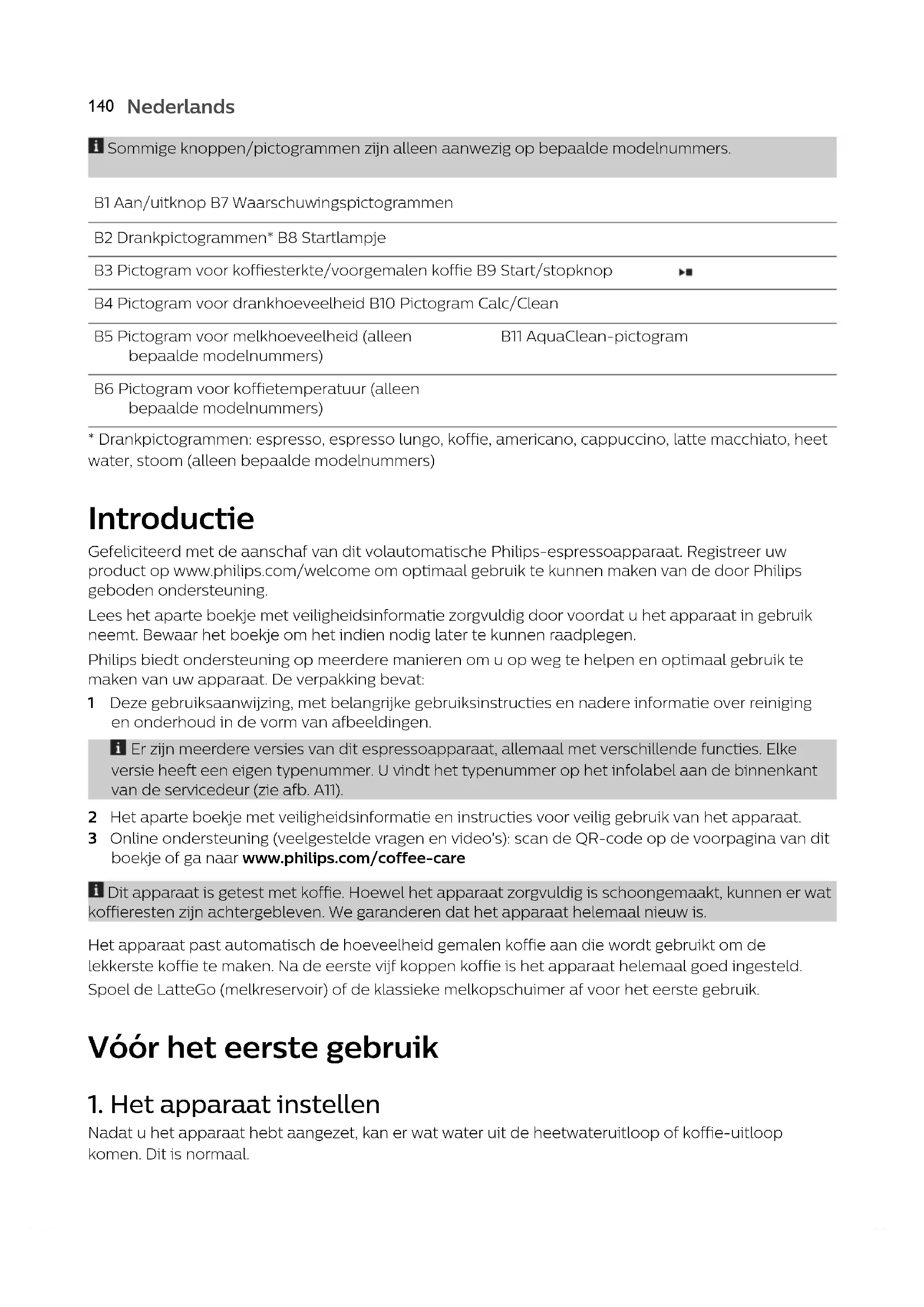 - Drankpictogrammen: espresso, espresso lungo, koffie, americano, cappuccino, latte macchiato, heet water, stoom (alleen bepaalde modelnummers) Introductie Gefeliciteerd met de aanschaf van dit volautomatische Philips-espressoapparaat. Registreer uw product op www.philips.com/welcome om optimaal gebruik te kunnen maken van de door Philips geboden ondersteuning. Lees het aparte boekje met veiligheidsinformatie zorgvuldig door voordat u het apparaat in gebruik neemt. Bewaar het boekje om het indien nodig later te kunnen raadplegen. Philips biedt ondersteuning op meerdere manieren om u op weg te helpen en optimaal gebruik te maken van uw apparaat. De verpakking bevat: 1 Deze gebruiksaanwijzing, met belangrijke gebruiksinstructies en nadere informatie over reiniging en onderhoud in de vorm van afbeeldingen. Er zijn meerdere versies van dit espressoapparaat, allemaal met verschillende functies. Elke versie heeft een eigen typenummer. U vindt het typenummer op het infolabel aan de binnenkant van de servicedeur (zie afb. A11). 2 Het aparte boekje met veiligheidsinformatie en instructies voor veilig gebruik van het apparaat. 3 Online ondersteuning (veelgestelde vragen en video's): scan de QR-code op de voorpagina van dit boekje of ga naar www.philips.com/coffee-care Dit apparaat is getest met koffie. Hoewel het apparaat zorgvuldig is schoongemaakt, kunnen er wat koffieresten zijn achtergebleven. We garanderen dat het apparaat helemaal nieuw is. Het apparaat past automatisch de hoeveelheid gemalen koffie aan die wordt gebruikt om de lekkerste koffie te maken. Na de eerste vijf koppen koffie is het apparaat helemaal goed ingesteld. Spoel de LatteGo (melkreservoir) of de klassieke melkopschuimer af voor het eerste gebruik. Vóór het eerste gebruik