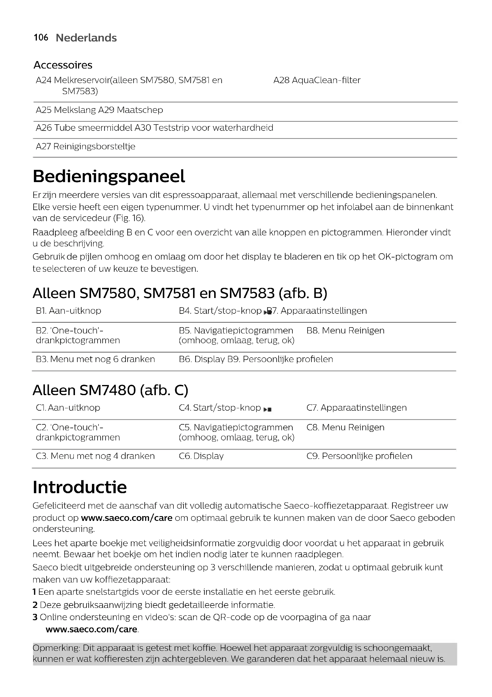 zijn meerdere versies van dit espressoapparaat, allemaal met verschillende bedieningspanelen.Elke versie heeft een eigen typenummer. U vindt het typenummer op het infolabel aan de binnenkantvan de servicedeur (Fig. 16).Raadpleeg afbeelding B en C voor een overzicht van alle knoppen en pictogrammen. Hieronder vindt de beschrijving. Gebruik de pijlen omhoog en omlaag om door het display te bladeren en tik op het OK-pictogram om selecteren of uw keuze te bevestigen. Alleen SM7580, SM7581 en SM7583 (afb. B) B1. Aan-uitknopB4. Start/stop-knop B7. Apparaatinstellingen B2. 'One-touch'-drankpictogrammenB5. Navigatiepictogrammen(omhoog, omlaag, terug, ok) B8. Menu Reinigen B3. Menu met nog 6 dranken B6. Display B9. Persoonlijke profielen Alleen SM7480 (afb. C) C1. Aan-uitknop C4. Start/stop-knop C7. Apparaatinstellingen C2. 'One-touch'-drankpictogrammenC5. Navigatiepictogrammen(omhoog, omlaag, terug, ok) C8. Menu ReinigenC3. Menu met nog 4 dranken C6. DisplayC9. Persoonlijke profielen Introductie Gefeliciteerd met de aanschaf van dit volledig automatische Saeco-koffiezetapparaat. Registreer uwproduct op www.saeco.com/care om optimaal gebruik te kunnen maken van de door Saeco gebodenondersteuning. Lees het aparte boekje met veiligheidsinformatie zorgvuldig door voordat u het apparaat in gebruikneemt. Bewaar het boekje om het indien nodig later te kunnen raadplegen.Saeco biedt uitgebreide ondersteuning op 3 verschillende manieren, zodat u optimaal gebruik kuntmaken van uw koffiezetapparaat:1 Een aparte snelstartgids voor de eerste installatie en het eerste gebruik.2 Deze gebruiksaanwijzing biedt gedetailleerde informatie.3 Online ondersteuning en video's: scan de QR-code op de voorpagina of ga naarwww.saeco.com/care.Opmerking: Dit apparaat is getest met koffie. Hoewel het apparaat zorgvuldig is schoongemaakt,kunnen er wat koffieresten zijn achtergebleven. We garanderen dat het apparaat helemaal nieuw is.