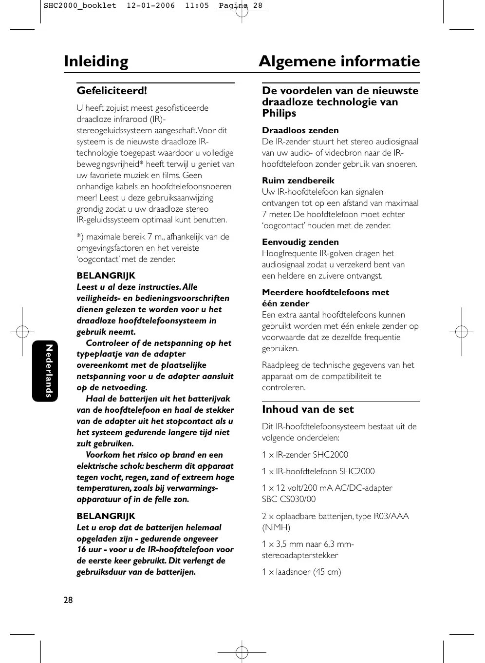SHC2000_booklet 12-01-2006 11:05 Pagina 28 Inleiding Gefeliciteerd! U heeft zojuist meest gesofisticeerde draadloze infrarood (IR)stereogeluidssysteem aangeschaft.Voor dit systeem is de nieuwste draadloze IRtechnologie toegepast waardoor u volledige bewegingsvrijheid* heeft terwijl u geniet van uw favoriete muziek en films. Geen onhandige kabels en hoofdtelefoonsnoeren meer! Leest u deze gebruiksaanwijzing grondig zodat u uw draadloze stereo IR-geluidssysteem optimaal kunt benutten. *) maximale bereik 7 m., afhankelijk van de omgevingsfactoren en het vereiste ‘oogcontact’ met de zender. Nederlands BELANGRIJK Leest u al deze instructies.Alle veiligheids- en bedieningsvoorschriften dienen gelezen te worden voor u het draadloze hoofdtelefoonsysteem in gebruik neemt. Controleer of de netspanning op het typeplaatje van de adapter overeenkomt met de plaatselijke netspanning voor u de adapter aansluit op de netvoeding. Haal de batterijen uit het batterijvak van de hoofdtelefoon en haal de stekker van de adapter uit het stopcontact als u het systeem gedurende langere tijd niet zult gebruiken. Voorkom het risico op brand en een elektrische schok: bescherm dit apparaat tegen vocht, regen, zand of extreem hoge temperaturen, zoals bij verwarmingsapparatuur of in de felle zon. BELANGRIJK Let u erop dat de batterijen helemaal opgeladen zijn - gedurende ongeveer 16 uur - voor u de IR-hoofdtelefoon voor de eerste keer gebruikt. Dit verlengt de gebruiksduur van de batterijen.