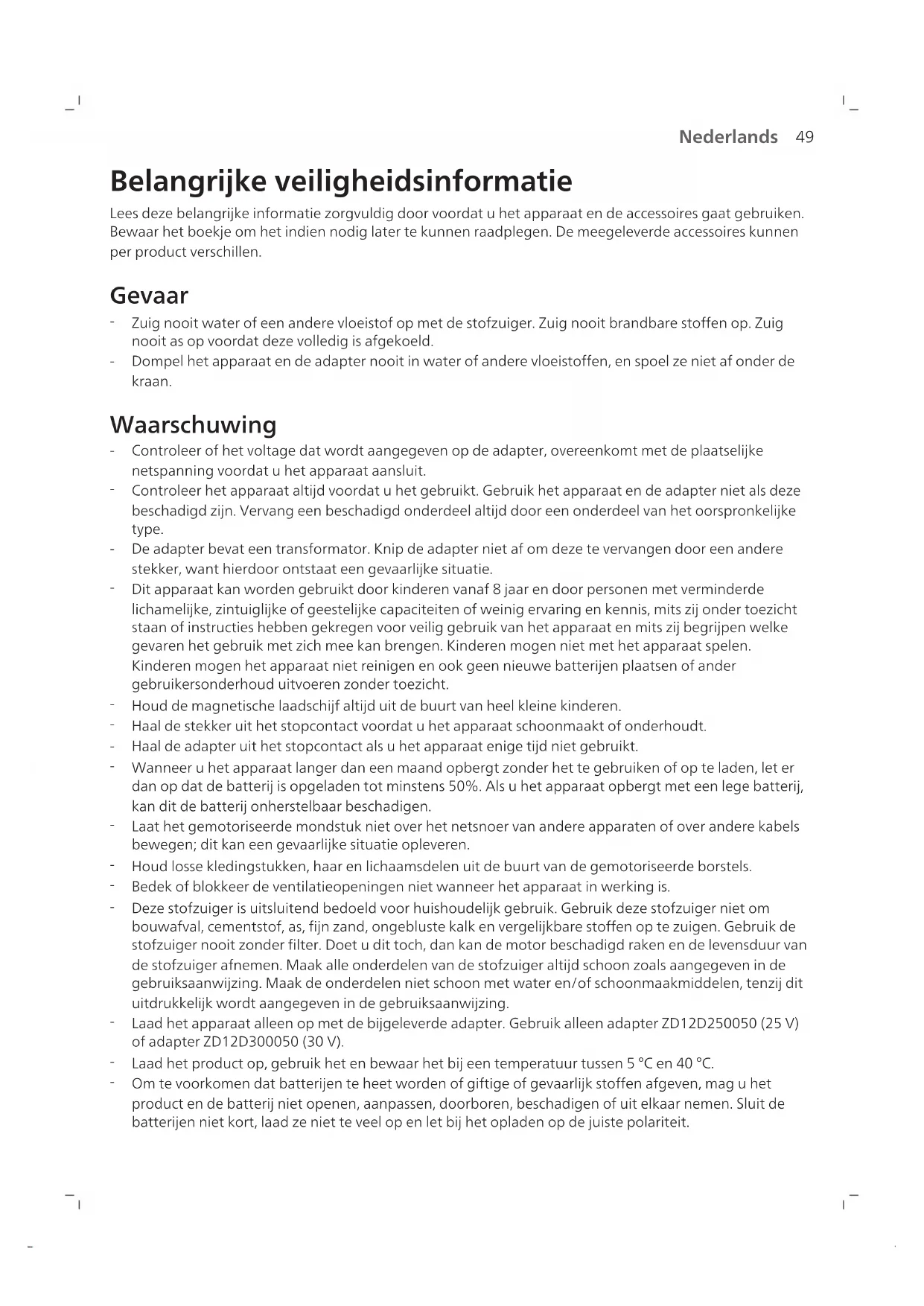 Deze stofzuiger is uitsluitend bedoeld voor huishoudelijk gebruik. Gebruik deze stofzuiger niet om bouwafval, cementstof, as, fijn zand, ongebluste kalk en vergelijkbare stoffen op te zuigen. Gebruik de stofzuiger nooit zonder filter. Doet u dit toch, dan kan de motor beschadigd raken en de levensduur van de stofzuiger afnemen. Maak alle onderdelen van de stofzuiger altijd schoon zoals aangegeven in de gebruiksaanwijzing. Maak de onderdelen niet schoon met water en/of schoonmaakmiddelen, tenzij dit uitdrukkelijk wordt aangegeven in de gebruiksaanwijzing.