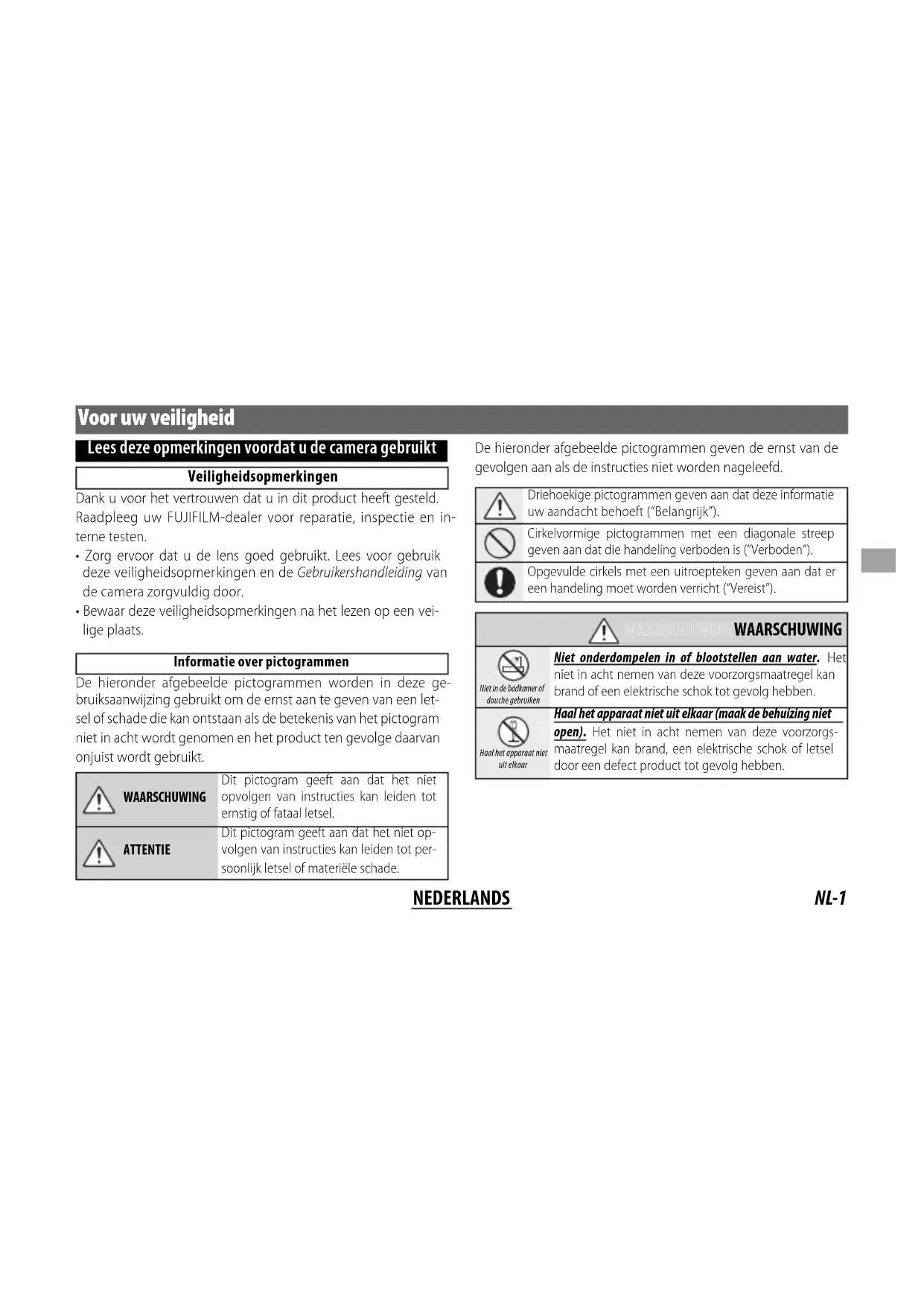 - Bewaar deze veiligheidsopmerkingen na het lezen op een vei- lige plaats. Informatie over pictogrammen De hieronder afgebeelde pictogrammen worden in deze ge- bruiksaanwijzing gebruikt om de ernst aan te geven van een let- sel of schade die kan ontstaan als de betekenis van het pictogram niet in acht wordt genomen en het product ten gevolge daarvan onjuist wordt gebruikt. WAARSCHUWINGDit pictogram geeft aan dat het niet opvolgen van instructies kan leiden tot ernstig of fataal letsel.ATTENTIEDit pictogram geeft aan dat het niet op-volgen van instructies kan leiden tot per-soonlijk letsel of materiële schade. De hieronder afgebeelde pictogrammen geven de ernst van de gevolgen aan als de instructies niet worden nageleefd. Driehoekige pictogrammen geven aan dat deze informatie uw aandacht behoeft (“Belangrijk”).Cirkelvormige pictogrammen met een diagonale streep geven aan dat die handeling verboden is (“Verboden”).Opgevulde cirkels met een uitroepteken geven aan dat er een handeling moet worden verricht (“Vereist”). WAARSCHUWINGWAARSCHUWING Niet in de badkamer of douche gebruikenNiet onderdompelen in of blootstellen aan water. Het niet in acht nemen van deze voorzorgsmaatregel kan brand of een elektrische schok tot gevolg hebben.Haal het apparaat niet uit elkaarHaal het apparaat niet uit elkaar (maak de behuizing niet open). Het niet in acht nemen van deze voorzorgs-maatregel kan brand, een elektrische schok of letsel door een defect product tot gevolg hebben.NL-2 NEDERLANDS WAARSCHUWINGWAARSCHUWING Raak geen interne onderdelen aan Mocht de behuizing openbreken door een val of ander ongeluk, raak de blootliggende onderdelen niet aan. Het niet in acht nemen van deze voorzorgsmaatregel kan een elektrische schok of letsel door het aanraken van beschadigde onderdelen tot gevolg hebben. Verwij- der onmiddellijk de camerabatterij en pas op voor let- sel of een elektrische schok. Breng het product naar het verkooppunt voor raadpleging. Plaats niet op onstabiele oppervlakken. Het product kan vallen, wat letsel tot gevolg kan hebben. Kijk niet in de zon door de zoekers van de lens of camera. Het niet in acht nemen van deze waarschuwing kan permanent oogletsel tot gevolg hebben. ATTENTIEATTENTIE Gebruik of bewaar niet op plaatsen blootgesteld aan stoom of rook of die zeer vochtig of uitermate sto g zijn. Het niet in acht nemen van deze voorzorgsmaatregel kan brand of een elektrische schok tot gevolg hebben. Laat niet in direct zonlicht liggen of op plaatsen die on- derhevig zijn aan zeer hoge temperaturen, zoals in een afgesloten voertuig op een zonnige dag. Het niet in acht nemen van deze voorzorgsmaatregel kan brand tot gevolg hebben. ATTENTIEATTENTIE Houd buiten het bereik van kleine kinderen. In de handen van kinderen kan dit product letsel veroorzaken. Hanteer niet met natte handen. Het niet in acht nemen van deze voorzorgsmaatregel kan een elektrische schok tot gevolg hebben. Houd de zon uit het beeld bij het fotograferen van onder- werpen met tegenlicht. Zonlicht dat wordt scherpge- steld in de camera wanneer de zon zich in het beeld of vlakbij het beeld bevindt, kan brand of brandwonden veroorzaken. Wanneer het product niet in gebruik is, plaats de lensdop- pen terug en bewaar niet in direct zonlicht. Zonlicht dat wordt scherpgesteld door de lens kan brand of brand- wonden tot gevolg hebben. Draag de camera of lens niet terwijl deze op een statief is bevestigd. Het product kan vallen of andere voorwer- pen raken, wat letsel tot gevolg kan hebben.NL-3 NEDERLANDS Inleveren van elektrische en elektronische apparatuur in particuliere Inleveren van elektrische en elektronische apparatuur in particuliere huishoudenshuishoudens In de Europese Unie, Noorwegen, IJsland en Liechtenstein: Dit symbool op het product of in de handleiding en in de garantievoorwaarden en/ of op de verpakking duidt aan dat dit product niet als huishoudelijk afval mag worden beschouwd. In plaats daarvan moet het apparaat bij een inzamelpunt voor recycling van elektrische en elektronische apparatuur worden ingeleverd. Door dit product op juiste wijze te verwijderen helpt u potentiële negatieve gevolgen voor het milieu en de gezondheid van de mens voorkomen. Onjuiste verwerking van dit product kan het milieu schaden. De recycling van materialen helpt bij het behoud van natuurlijke bronnen. Neem contact op met uw gemeente, uw inzamelpunt voor het inleveren van huishoudelijk afval of de winkel waar u het product hebt gekocht voor meer gedetailleerde informa- tie over recycling van dit product. In landen buiten de Europese Unie, Noorwegen, IJsland en Liechtenstein: Neem contact op met uw gemeente en vraag naar de juiste wijze waarop u dit product inclusief batterijen of accu’s dient te verwijderen.NL-4 NEDERLANDS Voordat u dit product gebruikt Sommige mogelijkheden van de lens zijn niet beschikbaar bij oudere versies van de camera rmware. Zorg ervoor dat u de camera rm- ware bijwerkt naar de laatste versie. Instructies voor het bekijken van de camera rmware-ver- sie en het updaten van camera rmware zijn beschikbaar op de volgende websites: http://www.fujifilm.com/support/digital_cameras/ software/#firmware Als u geen toegang hebt tot een computer, is on- dersteuning mogelijk via de plaatselijke verdeler vermeld in de “FUJIFILM Worldwide Network”- data die met uw camera wordt meegeleverd. Productverzorging