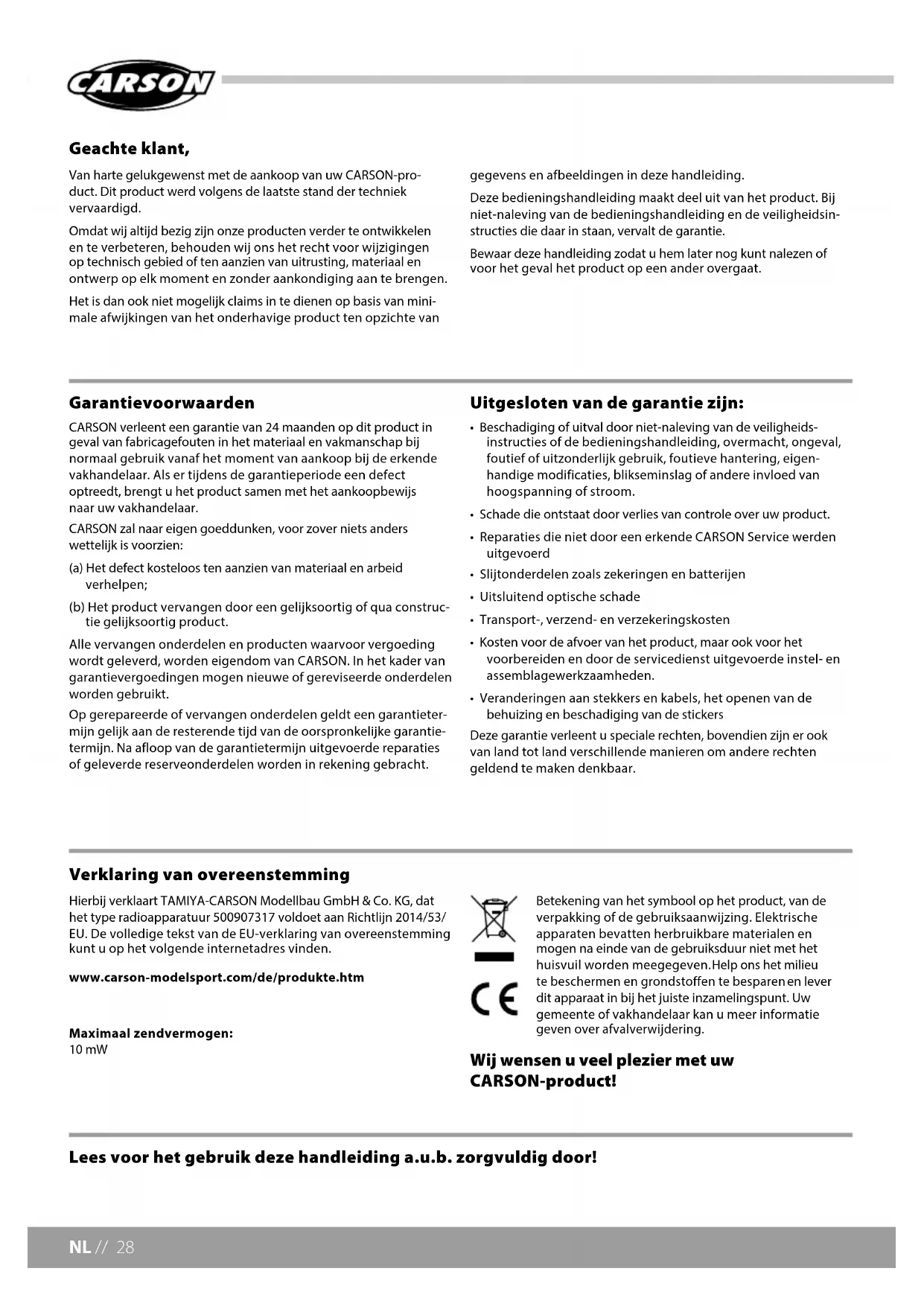 - Veranderingen aan stekkers en kabels, het openen van de behuizing en beschadiging van de stickers Deze garantie verleent u speciale rechten, bovendien zijn er ook van land tot land verschillende manieren om andere rechten geldend te maken denkbaar. Lees voor het gebruik deze handleiding a.u.b. zorgvuldig door! Hierbij verklaart TAMIYA-CARSON Modellbau GmbH & Co. KG, dat het type radioapparatuur 500907317 voldoet aan Richtlijn 2014/53/ EU. De volledige tekst van de EU-verklaring van overeenstemming kunt u op het volgende internetadres vinden. www.carson-modelsport.com/de/produkte.htm Maximaal zendvermogen: 10 mW Betekening van het symbool op het product, van de verpakking of de gebruiksaanwijzing. Elektrische apparaten bevatten herbruikbare materialen en mogen na einde van de gebruiksduur niet met het huisvuil worden meegegeven. Help ons het milieu te beschermen en grondstoffen te besparen en lever dit apparaat in bij het juiste inzamelingspunt. Uw gemeente of vakhandelaar kan u meer informatie geven over afvalverwijdering. Wij wensen u veel plezier met uw CARSON-product! Verklaring van overeenstemming29 // NL 1.Algemeen Nikkel-metaalhydride (NiMH) accu's zijn energieopslagmedia met een zeer hoge energiedichtheid die gevaar kunnen opleveren.Dit is de reden waarom u er heel voorzichtig mee moet omgaan bij het laden, ontladen, opslaan en het hanteren. Lees deze handleiding heel zorgvuldig voordat u de accu voor de eerste keer gebruikt.Volg altijd beslist de vermelde waarschuwingen en gebruiksaanwijzingen op. Onjuiste behandeling kan leiden tot risico's zoals explosies, oververhitting of brand. Niet opvolgen van de instructies voor het gebruik leidt tot voortijdige slijtage of andere defecten. Deze handleiding dient veilig opgeborgen te worden en in geval van doorgeven van de accu beslist meegegeven aan de volgende eigenaar. 2.Waarschuwingen