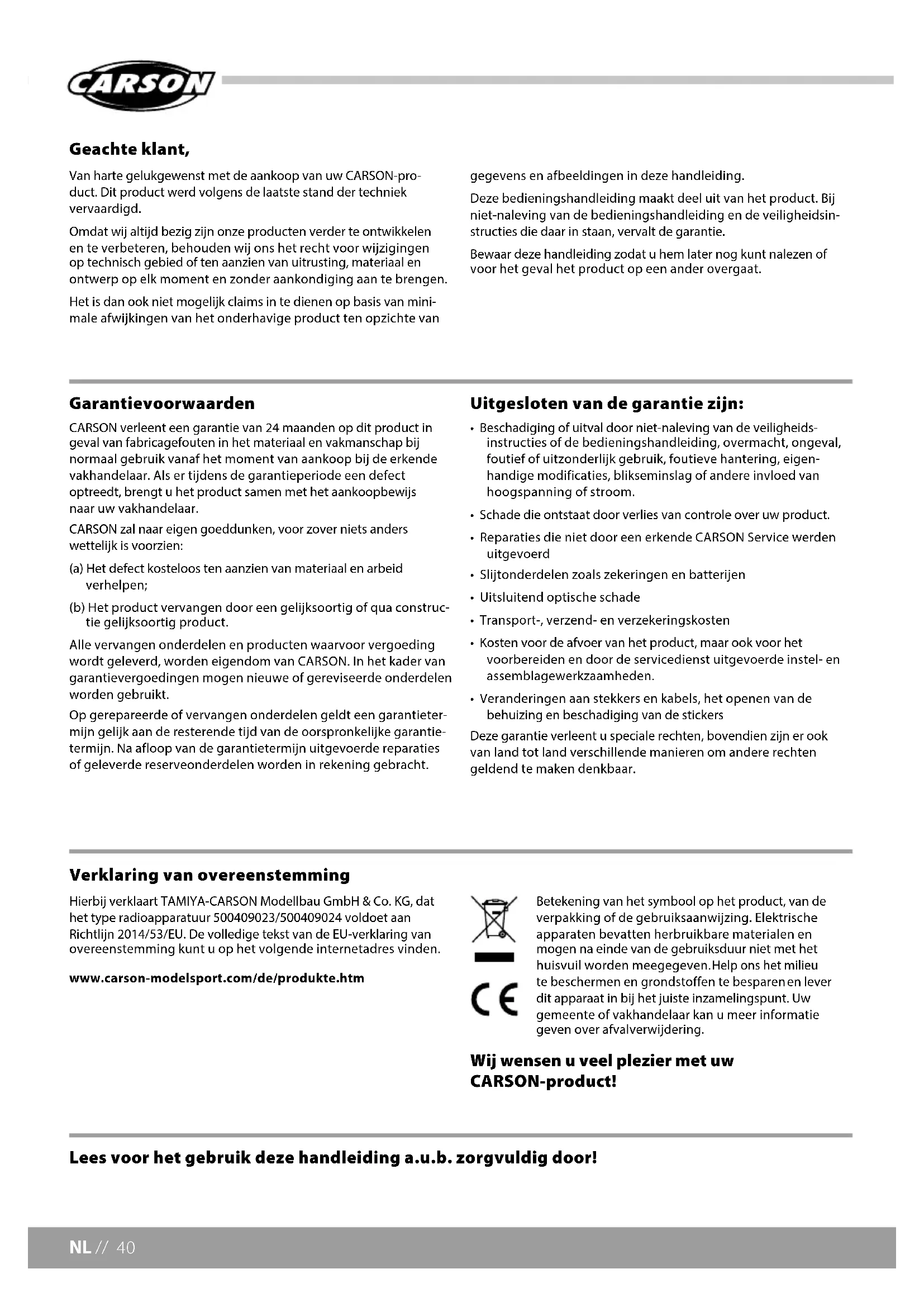 - Veranderingen aan stekkers en kabels, het openen van de behuizing en beschadiging van de stickers Deze garantie verleent u speciale rechten, bovendien zijn er ook van land tot land verschillende manieren om andere rechten geldend te maken denkbaar. Lees voor het gebruik deze handleiding a.u.b. zorgvuldig door! Hierbij verklaart TAMIYA-CARSON Modellbau GmbH & Co. KG, dat het type radioapparatuur 500409023/500409024 voldoet aan Richtlijn 2014/53/EU. De volledige tekst van de EU-verklaring van overeenstemming kunt u op het volgende internetadres vinden. www.carson-modelsport.com/de/produkte.htm Betekening van het symbool op het product, van de verpakking of de gebruiksaanwijzing. Elektrische apparaten bevatten herbruikbare materialen en mogen na einde van de gebruiksduur niet met het huisvuil worden meegegeven. Help ons het milieu te beschermen en grondstoffen te besparen en lever dit apparaat in bij het juiste inzamelingspunt. Uw gemeente of vakhandelaar kan u meer informatie geven over afvalverwijdering. Wij wensen u veel plezier met uw CARSON-product! Verklaring van overeenstemming41 // NL Dit product is geen speelgoed!