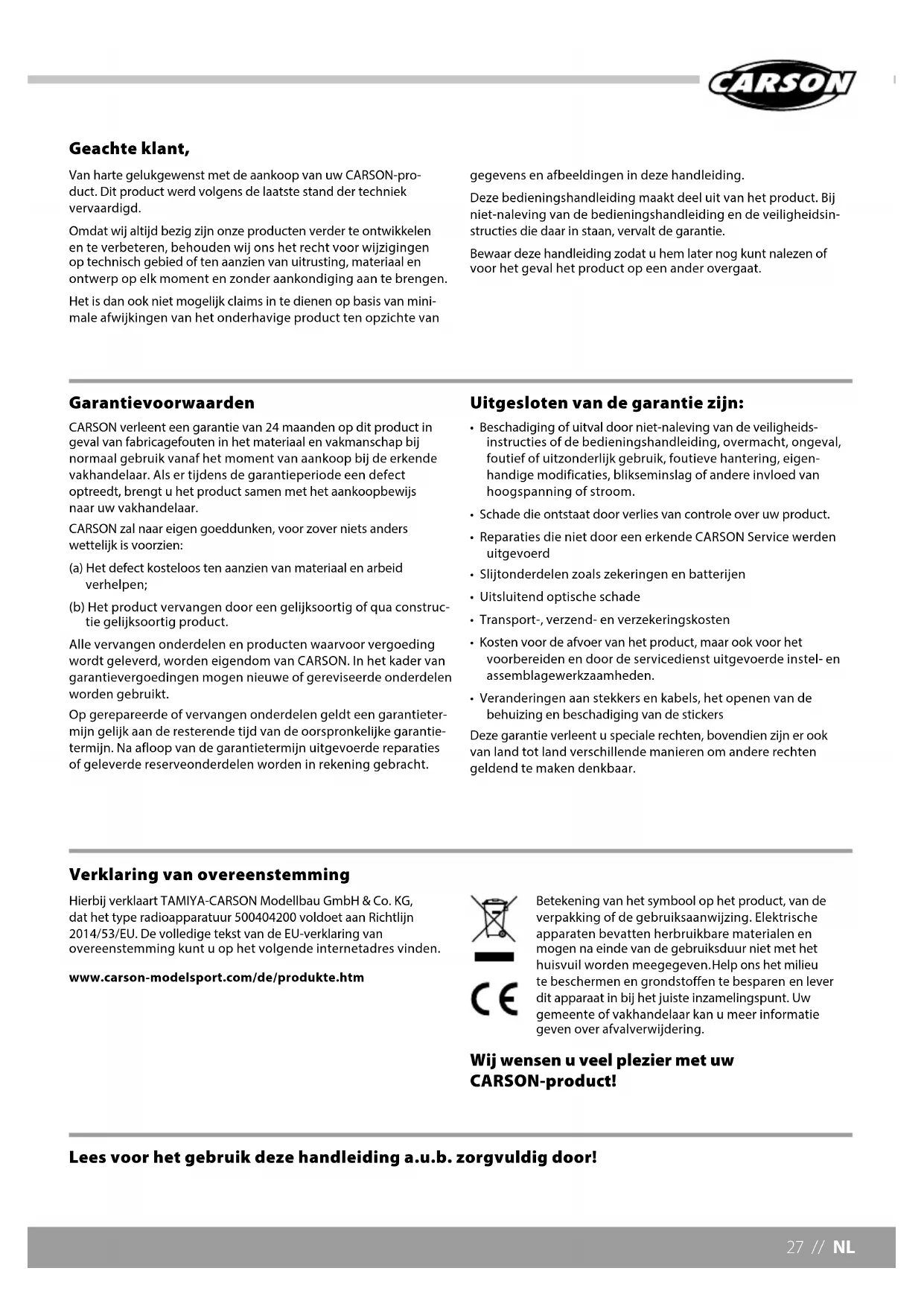- Veranderingen aan stekkers en kabels, het openen van de behuizing en beschadiging van de stickers Deze garantie verleent u speciale rechten, bovendien zijn er ook van land tot land verschillende manieren om andere rechten geldend te maken denkbaar. Lees voor het gebruik deze handleiding a.u.b. zorgvuldig door! Hierbij verklaart TAMIYA-CARSON Modellbau GmbH & Co. KG, dat het type radioapparatuur 500404200 voldoet aan Richtlijn 2014/53/EU. De volledige tekst van de EU-verklaring van overeenstemming kunt u op het volgende internetadres vinden. www.carson-modelsport.com/de/produkte.htm Betekening van het symbool op het product, van de verpakking of de gebruiksaanwijzing. Elektrische apparaten bevatten herbruikbare materialen en mogen na einde van de gebruiksduur niet met het huisvuil worden meegegeven. Help ons het milieu te beschermen en grondstoffen te besparen en lever dit apparaat in bij het juiste inzamelingspunt. Uw gemeente of vakhandelaar kan u meer informatie geven over afvalverwijdering. Wij wensen u veel plezier met uw CARSON-product! Verklaring van overeenstemmingNL // 28 1.Algemeen Nikkel-metaalhydride (NiMH) accu's zijn energieopslagmedia met een zeer hoge energiedichtheid die gevaar kunnen opleveren.Dit is de reden waarom u er heel voorzichtig mee moet omgaan bij het laden, ontladen, opslaan en het hanteren. Lees deze handleiding heel zorgvuldig voordat u de accu voor de eerste keer gebruikt.Volg altijd beslist de vermelde waarschuwingen en gebruiksaanwijzingen op. Onjuiste behandeling kan leiden tot risico's zoals explosies, oververhitting of brand. Niet opvolgen van de instructies voor het gebruik leidt tot voortijdige slijtage of andere defecten. Deze handleiding dient veilig opgeborgen te worden en in geval van doorgeven van de accu beslist meegegeven aan de volgende eigenaar. 2.Waarschuwingen