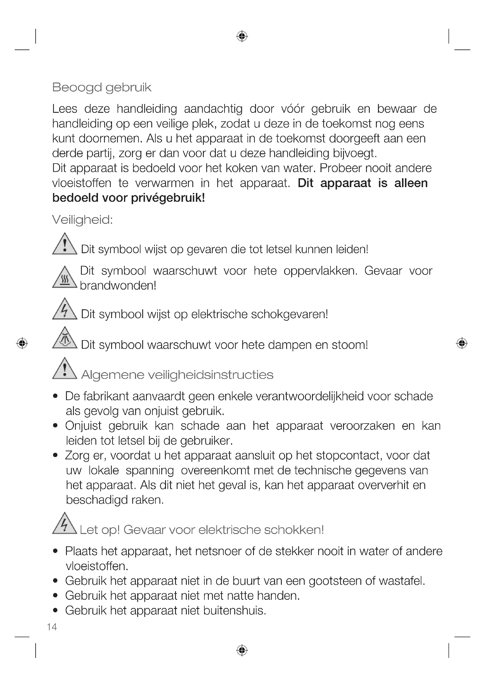 - for damages caused by owner This guarantee does not affect your statutory right, nor any legal right you may have as a costumer under applicable national legislation governing the purchase of goods. In order to assert his/her right in a guarantee case during the guaranteed period, the customer must provide evidence of the date of purchase (receipt). The guarantee is to be asserted against KORONA electric GmbH, Sundern/Germany. Service Address: KORONA Service, Am Steinbach 9, 59872 Meschede, Germany Telephone Hotline: 02933 90284-80 Mail: service@korona-electric.de web: www.korona-electric.de within 2 years after the date of purchase. In case of guarantee the customer is given the right to get the appliance repaired at our own or at an authorized shop. Further rights (due to guarantee case) are not given to the customer.14 Beoogd gebruik Lees deze handleiding aandachtig door vóór gebruik en bewaar de handleiding op een veilige plek, zodat u deze in de toekomst nog eens kunt doornemen. Als u het apparaat in de toekomst doorgeeft aan een derde partij, zorg er dan voor dat u deze handleiding bijvoegt. Dit apparaat is bedoeld voor het koken van water. Probeer nooit andere vloeistoffen te verwarmen in het apparaat. Dit apparaat is alleen bedoeld voor privégebruik! Veiligheid: Dit symbool wijst op gevaren die tot letsel kunnen leiden! Dit symbool waarschuwt voor hete oppervlakken. Gevaar voor brandwonden! Dit symbool wijst op elektrische schokgevaren! Dit symbool waarschuwt voor hete dampen en stoom! Algemene veiligheidsinstructies