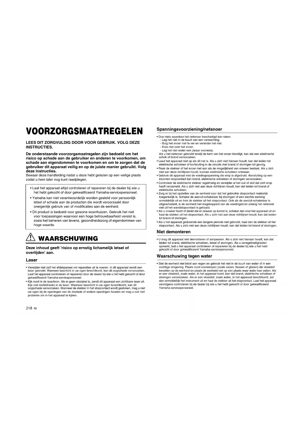 - Verwijder niet zelf het afdekpaneel om reparaties uit te voeren. In dit apparaat wordt een laser gebruikt. Wanneer laserlicht in uw ogen terechtkomt, kan dit oogschade veroorzaken. Laat het apparaat controleren of repareren door de dealer bij wie u het hebt gekocht of door gekwalificeerd Yamaha-servicepersoneel.• Kijk nooit in de laserbron. Als er geen obstakel is, zendt dit apparaat een zichtbare laser uit. Kijk niet rechtstreeks in de laser. Wanneer laserlicht in uw ogen terechtkomt, kan dit oogschade veroorzaken. Wanneer de stekker in het stopcontact wordt gestoken, mag u niet uw ogen bij de openingen van de disclade of andere openingen houden en mag u ook niet proberen om in het apparaat te kijken. Spanningsvoorziening/netsnoer
