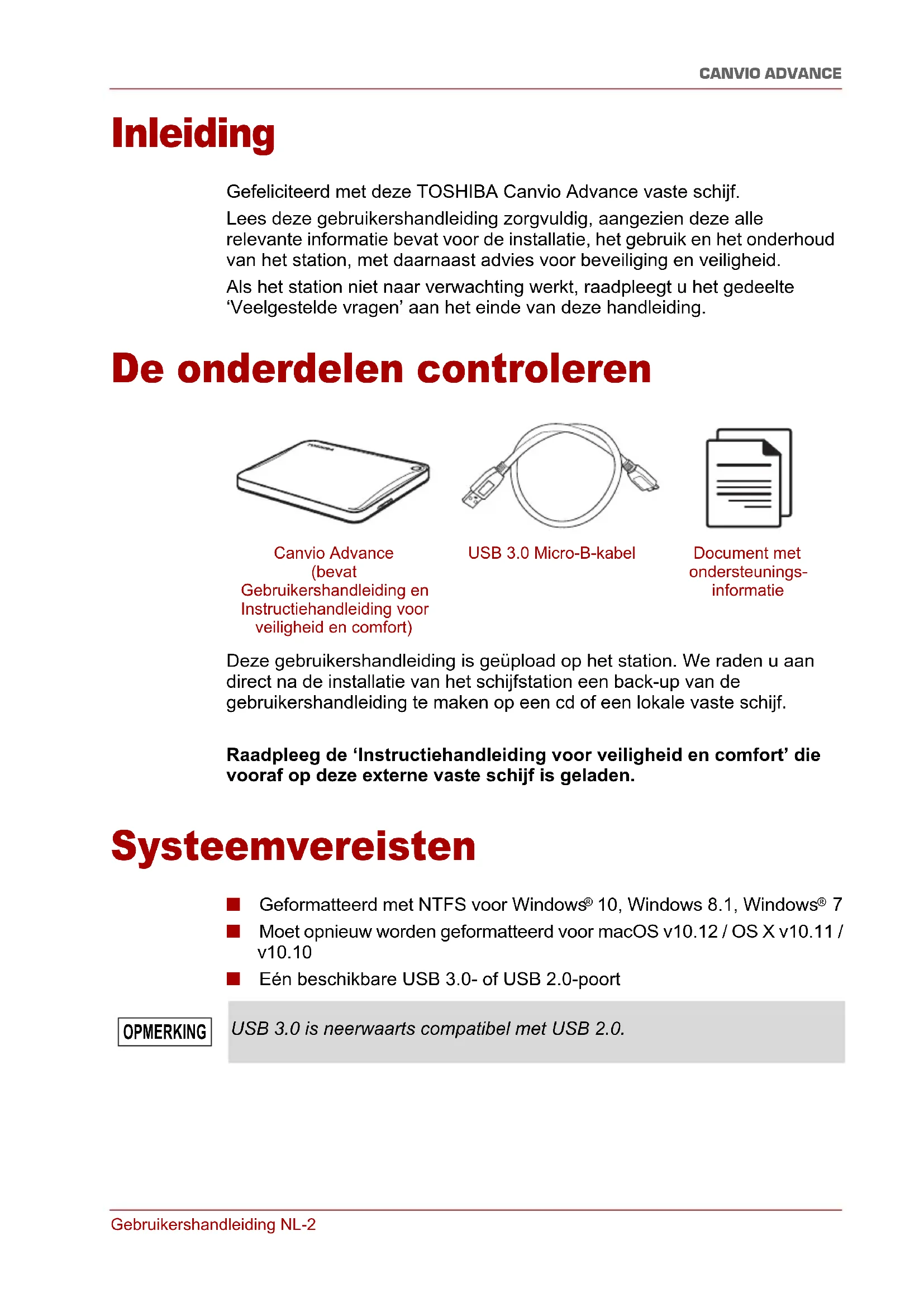 - Voorschriften Gebruikershandleiding NL-2 CANVIO ADVANCE Inleiding Gefeliciteerd met deze TOSHIBA Canvio Advance vaste schijf. Lees deze gebruikershandleiding zorgvuldig, aangezien deze alle relevante informatie bevat voor de installatie, het gebruik en het onderhoud van het station, met daarnaast advies voor beveiliging en veiligheid. Als het station niet naar verwachting werkt, raadpleegt u het gedeelte ‘Veelgestelde vragen’ aan het einde van deze handleiding. De onderdelen controleren Deze gebruikershandleiding is geüpload op het station. We raden u aan direct na de installatie van het schijfstation een back-up van de gebruikershandleiding te maken op een cd of een lokale vaste schijf. Raadpleeg de ‘Instructiehandleiding voor veiligheid en comfort’ die vooraf op deze externe vaste schijf is geladen. Systeemvereisten ■ Geformatteerd met NTFS voor Windows p. 7