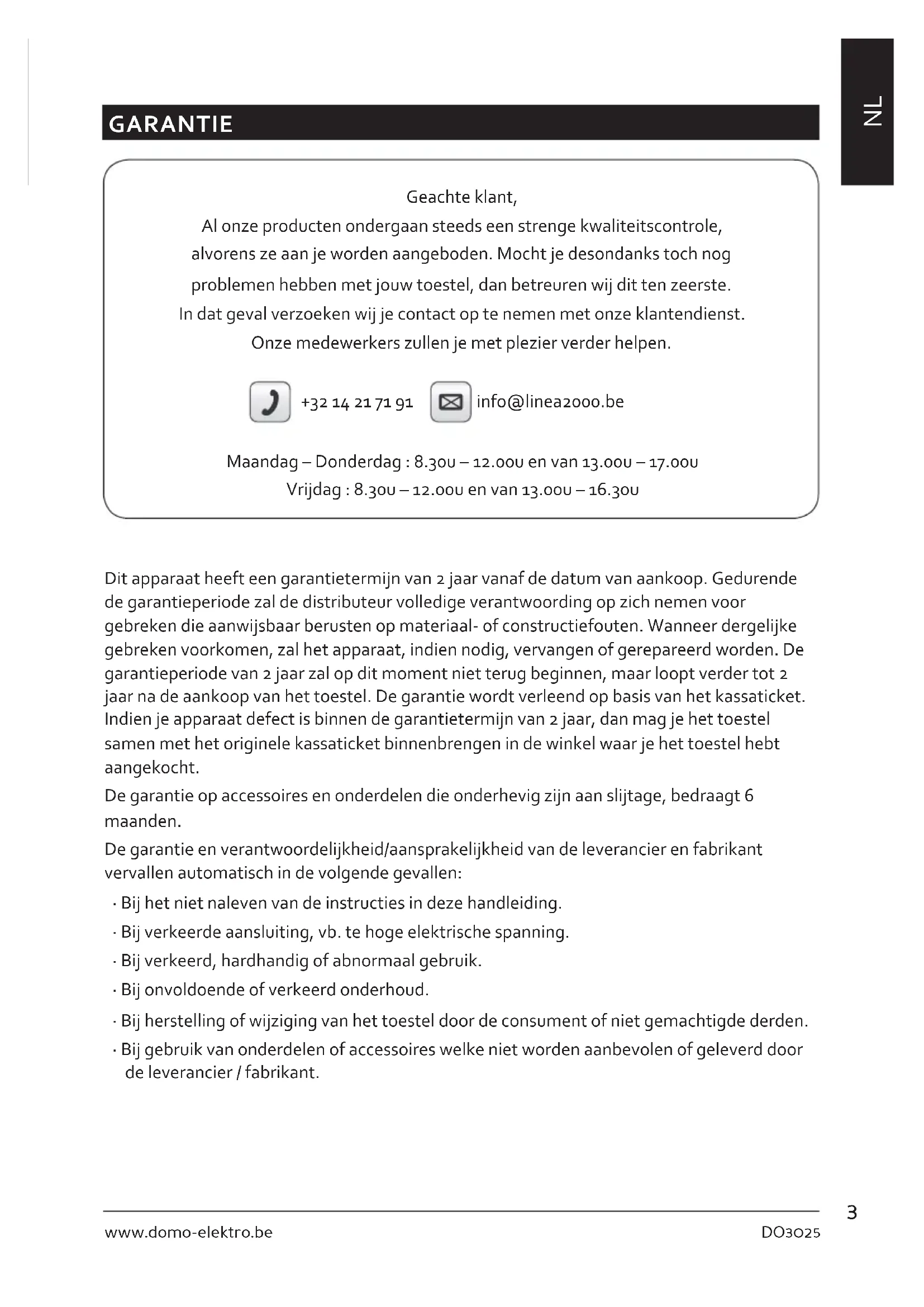 GARANTIE Geachte klant, Al onze producten ondergaan steeds een strenge kwaliteitscontrole, alvorens ze aan je worden aangeboden. Mocht je desondanks toch nog problemen hebben met jouw toestel, dan betreuren wij dit ten zeerste. In dat geval verzoeken wij je contact op te nemen met onze klantendienst. Onze medewerkers zullen je met plezier verder helpen. +32 14 21 71 91 info@linea2000.be Maandag – Donderdag : 8.30u – 12.00u en van 13.00u – 17.00u Vrijdag : 8.30u – 12.00u en van 13.00u – 16.30u Dit apparaat heeft een garantietermijn van 2 jaar vanaf de datum van aankoop. Gedurende de garantieperiode zal de distributeur volledige verantwoording op zich nemen voor gebreken die aanwijsbaar berusten op materiaal- of constructiefouten. Wanneer dergelijke gebreken voorkomen, zal het apparaat, indien nodig, vervangen of gerepareerd worden. De garantieperiode van 2 jaar zal op dit moment niet terug beginnen, maar loopt verder tot 2 jaar na de aankoop van het toestel. De garantie wordt verleend op basis van het kassaticket. Indien je apparaat defect is binnen de garantietermijn van 2 jaar, dan mag je het toestel samen met het originele kassaticket binnenbrengen in de winkel waar je het toestel hebt aangekocht. De garantie op accessoires en onderdelen die onderhevig zijn aan slijtage, bedraagt 6 maanden. De garantie en verantwoordelijkheid/aansprakelijkheid van de leverancier en fabrikant vervallen automatisch in de volgende gevallen: