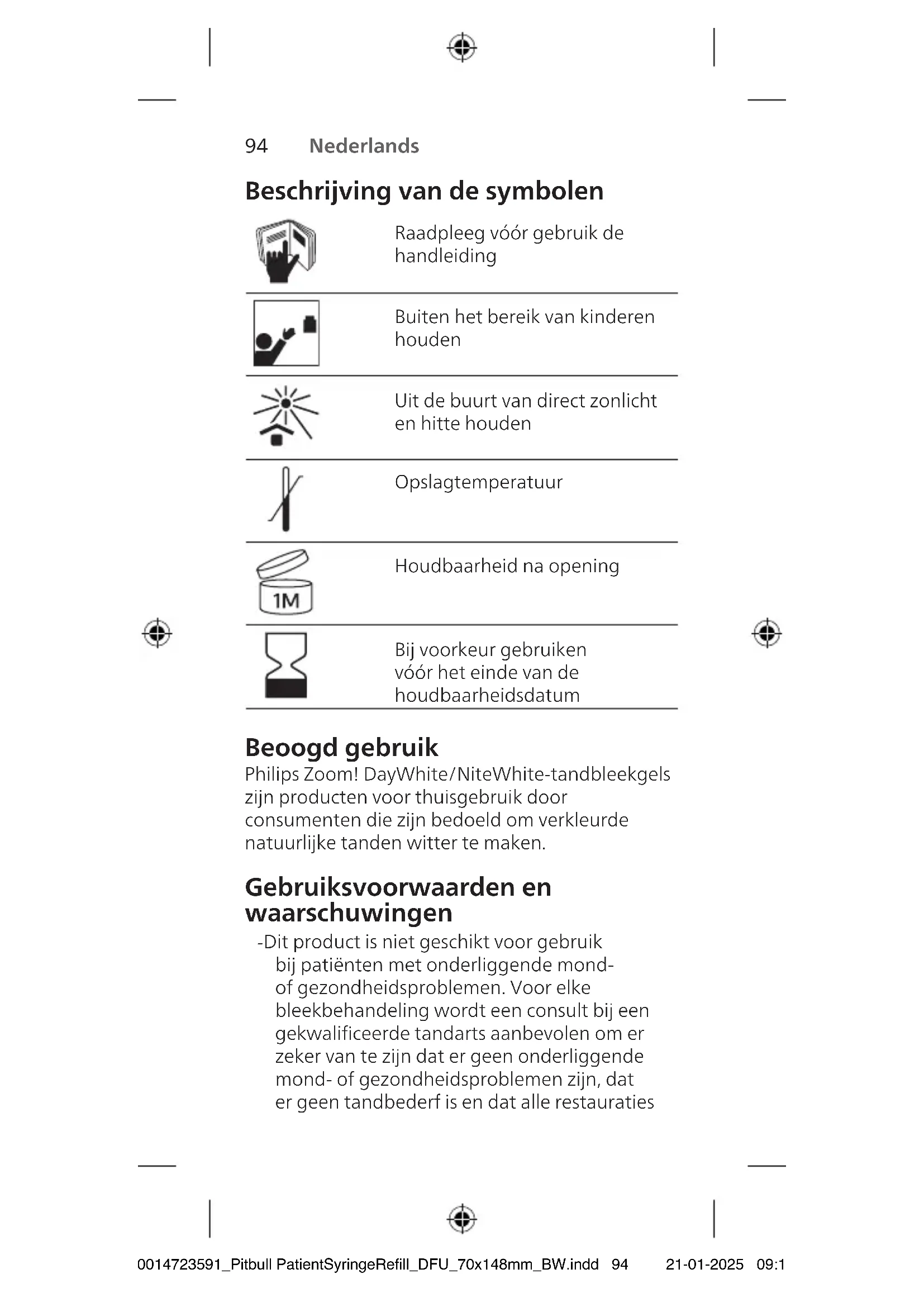 9 Spoel de bleeklepels na het bleken met koud water. Gebruik indien nodig een tandenborstel om overtollige gel uit de lepels te verwijderen. Plaats de bleeklepels in het opbergdoosje en laat ze aan de lucht drogen voordat u het doosje sluit. Waarschuwing: Gebruik geen heet water om de lepels schoon te maken en plaats ze ook niet in de vaatwasser. Als u dit wel doet, zullen ze vervormen. Opmerking: Het is normaal dat u in de lepels donkere vlekken ziet op de plaats van (zilverkleurige) amalgaamvullingen. Gel oxideert oppervlakkige vlekken op amalgaamvullingen, maar heeft geen invloed op het bleekproces. 10 Spoel en poets uw tanden om overtollige gel te verwijderen. 11 Bewaar de lepels en de spuiten op een koele, droge plaats tussen 15 °C en 25 °C. De gel niet bewaren in de koelkast of invriezen. Behandeltijd Productnaam Aanbevolen draagtijd DayWhite 6% HP één keer per dag 30-60minuten of twee keer per dag 30-45minuten NiteWhite 10% CP één keer per dag 4-6 uur of gedurende de nacht NiteWhite 16% CP één keer per dag 4-6 uur of gedurende de nacht - Plan, indien mogelijk, een vervolgafspraak met uw tandarts voor twee weken na de start van de bleekbehandeling om het eindresultaat te bespreken. 300014723591_Pitbull PatientSyringeRefill_DFU_70x148mm_BW.indd 100300014723591_Pitbull PatientSyringeRefill_DFU_70x148mm_BW.indd 100 21-01-2025 09:1121-01-2025 09:11100 Nederlands Nederlands 101 om de hele tand te bedekken met bleekgel. Elke 2,4mm-spuit bevat genoeg bleekgel voor drie keer gebruik (bij gebruik van beide bleeklepels). 6 Plaats de bleeklepel met gel in uw mond. Let op dat u de gel niet uit de bleeklepel duwt wanneer u de lepel over uw tanden plaatst. Het is normaal dat de gel in de bleeklepels belletjes vormt. - Let extra goed op dat er geen gel op uw tandvlees komt. Verwijder overtollige gel met een wattenstaafje of een droge tandenborstel. - Zie ‚Behandeltijd‘ voor de aanbevolen draagtijd. Het overschrijden van de aangegeven behandeltijd kan leiden tot gevoelige tanden en/of irritatie van het tandvlees, en leidt niet tot betere resultaten. 7 Plaats de tipbeschermer op de tip van het mondstuk. 8 Neem de mengkop van de spuit door deze linksom te draaien. Plaats na gebruik de transparante beschermkap voor opslag, zodat de bestanddelen in beide zijden van het reservoir gescheiden blijven.