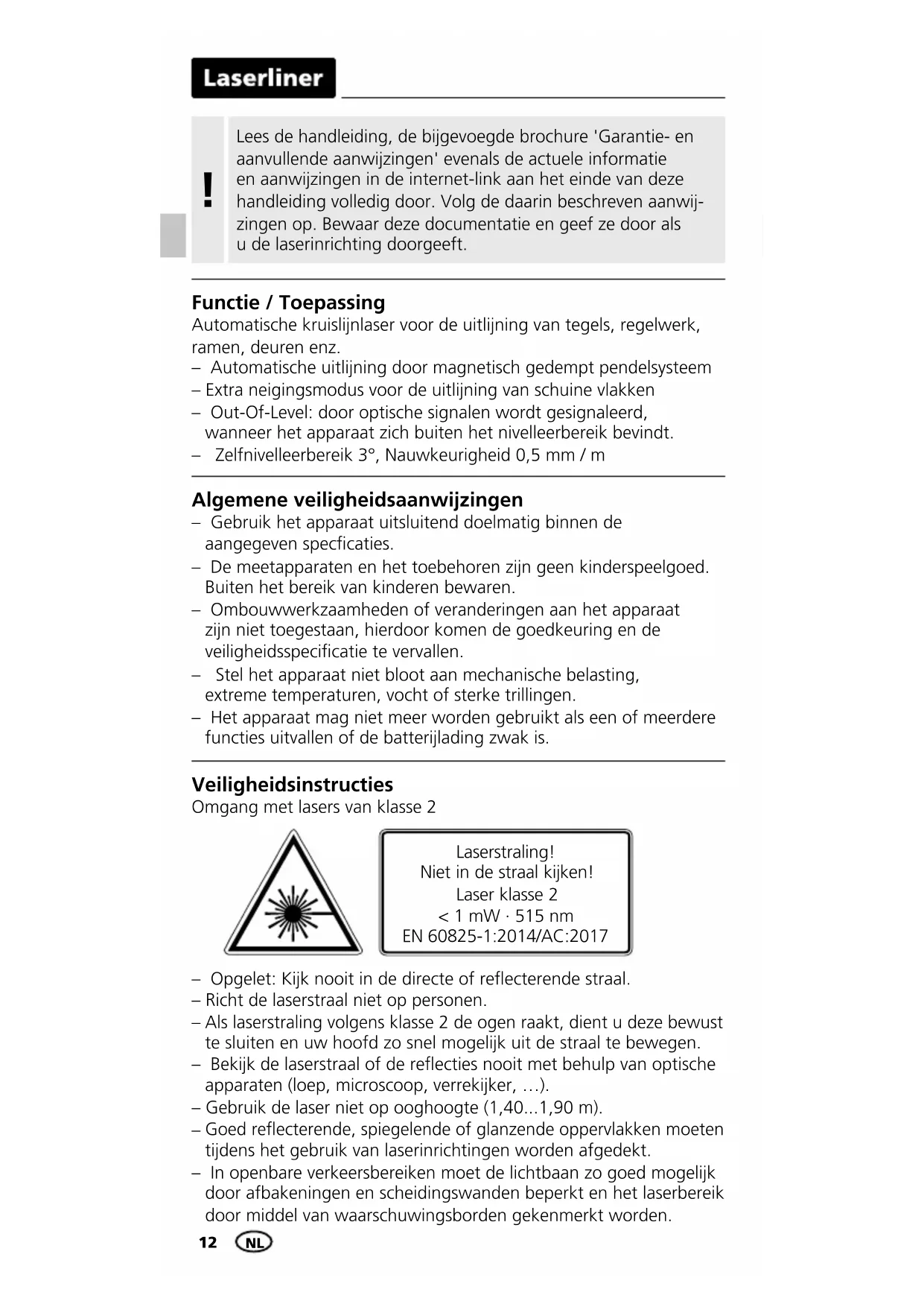 Functie / Toepassing Automatische kruislijnlaser voor de uitlijning van tegels, regelwerk, ramen, deuren enz. – Automatische uitlijning door magnetisch gedempt pendelsysteem – Extra neigingsmodus voor de uitlijning van schuine vlakken – Out-Of-Level: door optische signalen wordt gesignaleerd, wanneer het apparaat zich buiten het nivelleerbereik bevindt. – Zelfnivelleerbereik 3°, Nauwkeurigheid 0,5 mm / m Laserstraling! Niet in de straal kijken! Laser klasse 2 < 1 mW · 515 nm EN 60825-1:2014/AC:2017 – Opgelet: Kijk nooit in de directe of reecterende straal. – Richt de laserstraal niet op personen.