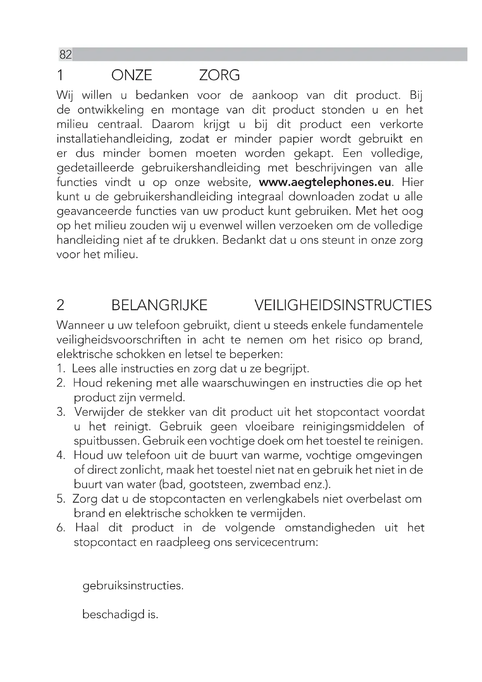 Vous ne devez nettoyer aucune pièce de votre téléphone avec du benzène, des diluants ou d‘autres produits chimiques solvants car cela risque d‘entraîner des dommages irréversibles qui ne sont pas couverts par la garantie. Au besoin, nettoyez le téléphone avec un chiffon humide. Faites en sorte que votre téléphone ne soit pas soumis à des conditions chaudes et humides, ni à un fort ensoleillement et évitez de le mouiller.82 1 ONZE ZORG Wij willen u bedanken voor de aankoop van dit product. Bij de ontwikkeling en montage van dit product stonden u en het milieu centraal. Daarom krijgt u bij dit product een verkorte installatiehandleiding, zodat er minder papier wordt gebruikt en er dus minder bomen moeten worden gekapt. Een volledige, gedetailleerde gebruikershandleiding met beschrijvingen van alle functies vindt u op onze website, www.aegtelephones.eu. Hier kunt u de gebruikershandleiding integraal downloaden zodat u alle geavanceerde functies van uw product kunt gebruiken. Met het oog op het milieu zouden wij u evenwel willen verzoeken om de volledige handleiding niet af te drukken. Bedankt dat u ons steunt in onze zorg voor het milieu. 2 BELANGRIJKE VEILIGHEIDSINSTRUCTIES Wanneer u uw telefoon gebruikt, dient u steeds enkele fundamentele veiligheidsvoorschriften in acht te nemen om het risico op brand, elektrische schokken en letsel te beperken: