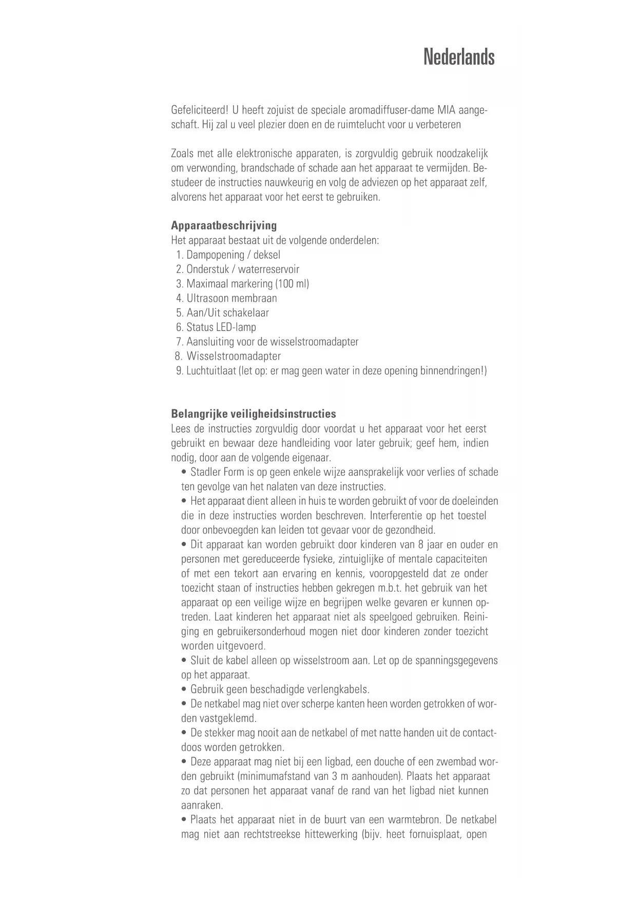 Wymiary 101 x 90 mm (średnica × wysokość) Waga 0.3 kg Pojemność zbiornika 100 ml Głośność < 26 dB(A) Zgodne z UE CE / WEEE / RoHS / EAC Zastrzega się możliwość zmian technicznychGefeliciteerd! U heeft zojuist de speciale aromadiffuser-dame MIA aange- schaft. Hij zal u veel plezier doen en de ruimtelucht voor u verbeteren Zoals met alle elektronische apparaten, is zorgvuldig gebruik noodzakelijk om verwonding, brandschade of schade aan het apparaat te vermijden. Be- studeer de instructies nauwkeurig en volg de adviezen op het apparaat zelf, alvorens het apparaat voor het eerst te gebruiken. Apparaatbeschrijving Het apparaat bestaat uit de volgende onderdelen: