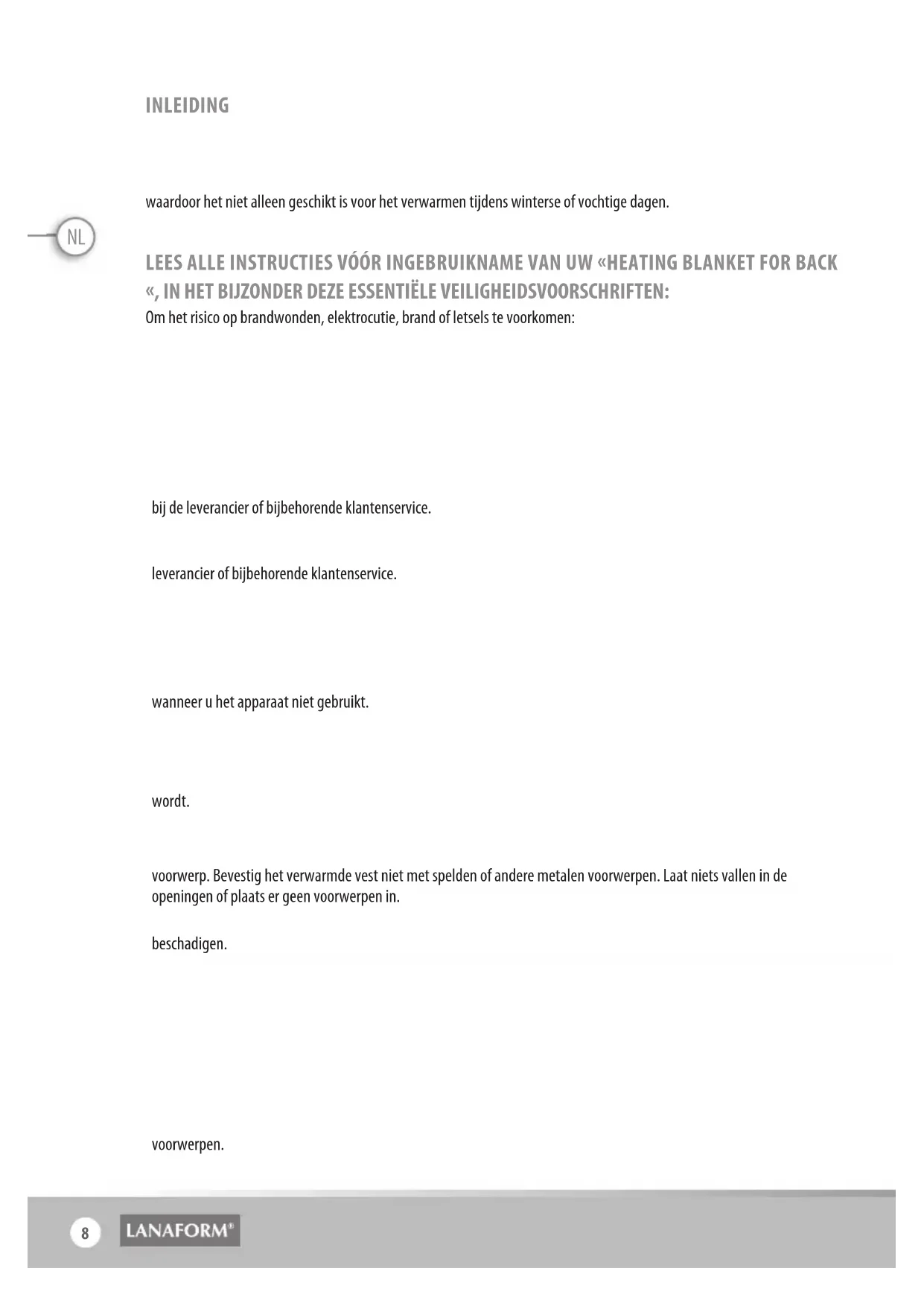 Heating Blanket for BackNL INLEIDING Bedankt voor het kiezen van het verwarmde vest «Heating Blanket for Back» van LANAFORM®. Het verwarmde vest «Heating Blanket for Back» van LANAFORM® werd uitvoerig getest en voldoet aan de geldende Europese normen. Bovendien biedt dit verwarmde vest een trapsgewijze temperatuurregeling met 3 warmteniveaus, waardoor het niet alleen geschikt is voor het verwarmen tijdens winterse of vochtige dagen. LEES ALLE INSTRUCTIES VÓÓR INGEBRUIKNAME VAN UW «HEATING BLANKET FOR BACK «, IN HET BIJZONDER DEZE ESSENTIËLE VEILIGHEIDSVOORSCHRIFTEN: Om het risico op brandwonden, elektrocutie, brand of letsels te voorkomen: