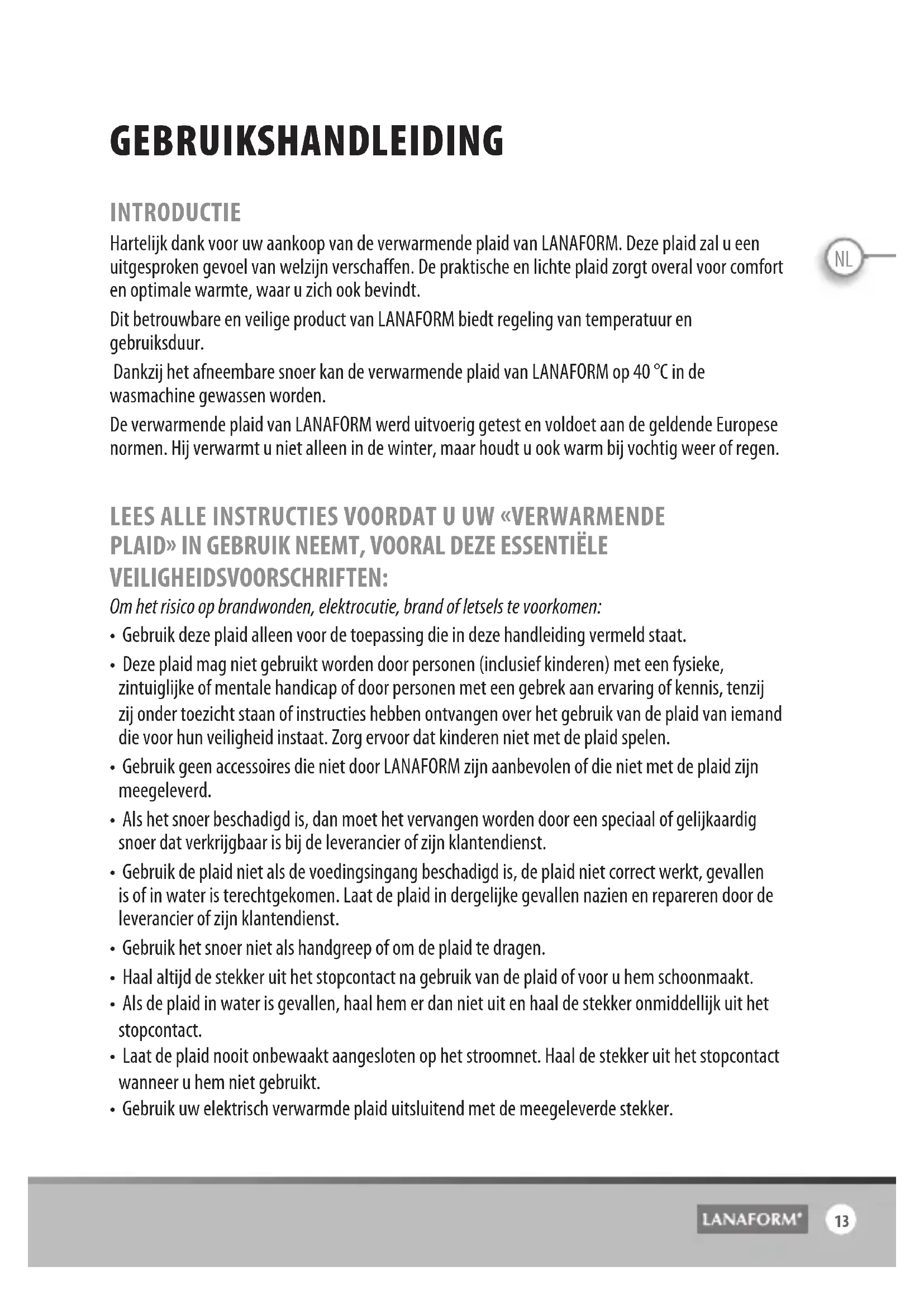 FRNL GEBRUIKSHANDLEIDING INTRODUCTIE Hartelijk dank voor uw aankoop van de verwarmende plaid van LANAFORM. Deze plaid zal u een uitgesproken gevoel van welzijn verschaffen. De praktische en lichte plaid zorgt overal voor comfort en optimale warmte, waar u zich ook bevindt. Dit betrouwbare en veilige product van LANAFORM biedt regeling van temperatuur en gebruiksduur. Dankzij het afneembare snoer kan de verwarmende plaid van LANAFORM op 40 °C in de wasmachine gewassen worden. De verwarmende plaid van LANAFORM werd uitvoerig getest en voldoet aan de geldende Europese normen. Hij verwarmt u niet alleen in de winter, maar houdt u ook warm bij vochtig weer of regen. LEES ALLE INSTRUCTIES VOORDAT U UW «VERWARMENDE PLAID» IN GEBRUIK NEEMT, VOORAL DEZE ESSENTIËLE VEILIGHEIDSVOORSCHRIFTEN: Om het risico op brandwonden, elektrocutie, brand of letsels te voorkomen: