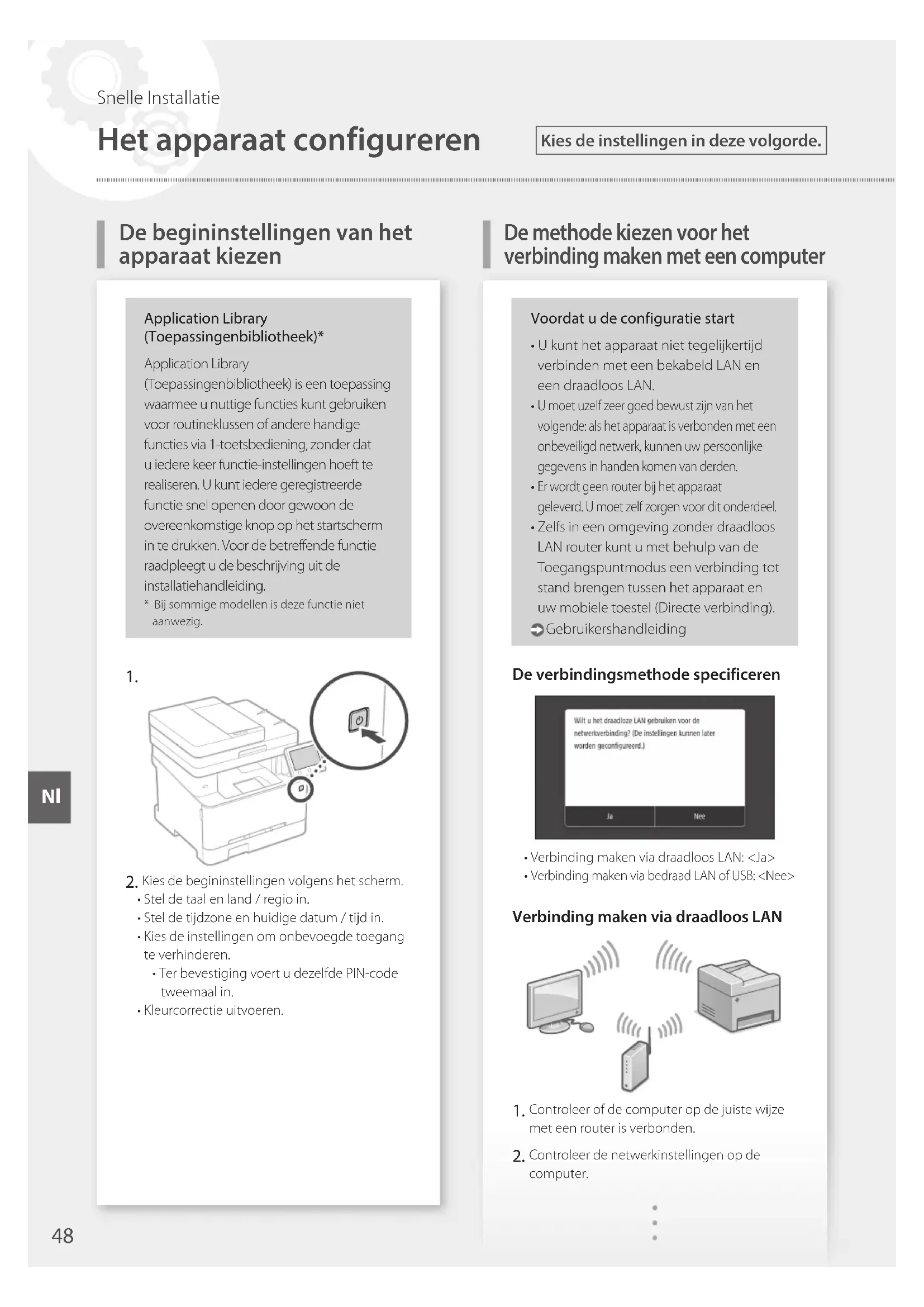 Het apparaat configureren De begininstellingen van het apparaat kiezen Kies de instellingen in deze volgorde. Snelle Installatie NlVoor meer informatie "Instellen met behulp van de installatiehandleiding" in de Gebruikershandleiding RegistreerdeSSIDennetwerksleutel.•Controleerhetetiketopderouter. Gebruikershandleiding•Deinstelprocedureisgemakkelijkeralsderouter is voorzien van een WPS-merkteken. Gebruikershandleiding Stel het toegangspunt en netwerksleutel in volgens het onderstaande scherm.1. Selecteer <OK>.2. Selecteer <SSID-instellingen>.3. Selecteer <Selecteer toegangspunt>.4. Selecteer het toegangspunt (SSID), en selecteer<Volgende>.5. Voer een WEP-sleutel (netwerksleutel) in, en selecteer <Toepassen>.6. Selecteer<Ja>.•Wachttotdemelding<Verbonden.>wordtweergegeven.7. Selecteer<Sluiten>.•HetIP-adreswordtbinneneenpaarminutenautomatisch geconfigureerd. Installeer het stuurprogramma en de software. Pag. 50 "De software installeren"Nu hebt u de configuratie van de begininstellingen voltooid.Als het apparaat een faxfunctie heeft, kies dan nu de faxinstellingen. Pag. 51 Verbinding maken via bedraad LAN Er wordt geen LAN-kabel bij het apparaat geleverd.Zorgdatudezeopvoorraadhebt,mochtuhemnodig hebben. Controleer of de computer op de juiste wijze met een router is verbonden. Controleer de netwerkinstellingen op de computer. De LAN-kabel aansluiten.•Nahetaansluitenvandekabelwachtueenpaar minuten (tot het IP-adres automatisch wordt ingesteld).•AlsopdecomputereenstatischIP-adresisingesteld, moet u het IP-adres van het apparaat handmatig instellen. Installeer het stuurprogramma en de software. Pag. 50 "De software installeren"Nu hebt u de configuratie van de begininstellingen voltooid.Als het apparaat een faxfunctie heeft, kies dan nu de faxinstellingen. Pag. 51
