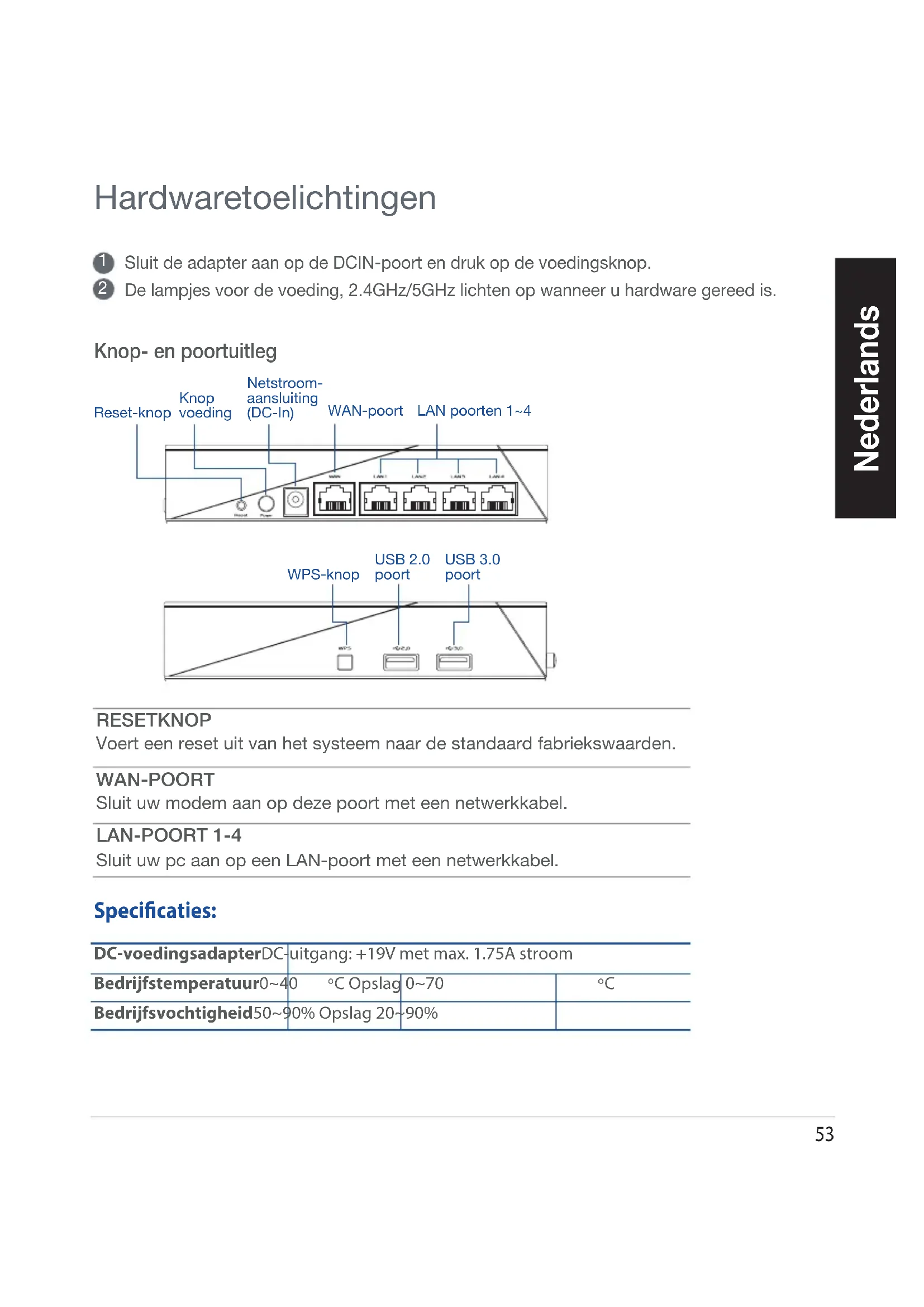 De lampjes voor de voeding, 2.4GHz/5GHz lichten op wanneer u hardware gereed is. Hardwaretoelichtingen Knop- en poortuitleg RESETKNOP Voert een reset uit van het systeem naar de standaard fabriekswaarden. WAN-POORT Sluit uw modem aan op deze poort met een netwerkkabel. LAN-POORT 1-4 Sluit uw pc aan op een LAN-poort met een netwerkkabel. WPS-knopKnop voedingNetstroom-aansluiting (DC-In)USB 2.0 poortWAN-poortLAN poorten 1~4Reset-knopUSB 3.0 poort DC-voedingsadapter DC-uitgang: +19V met max. 1.75A stroom Bedrijfstemperatuur 0~40