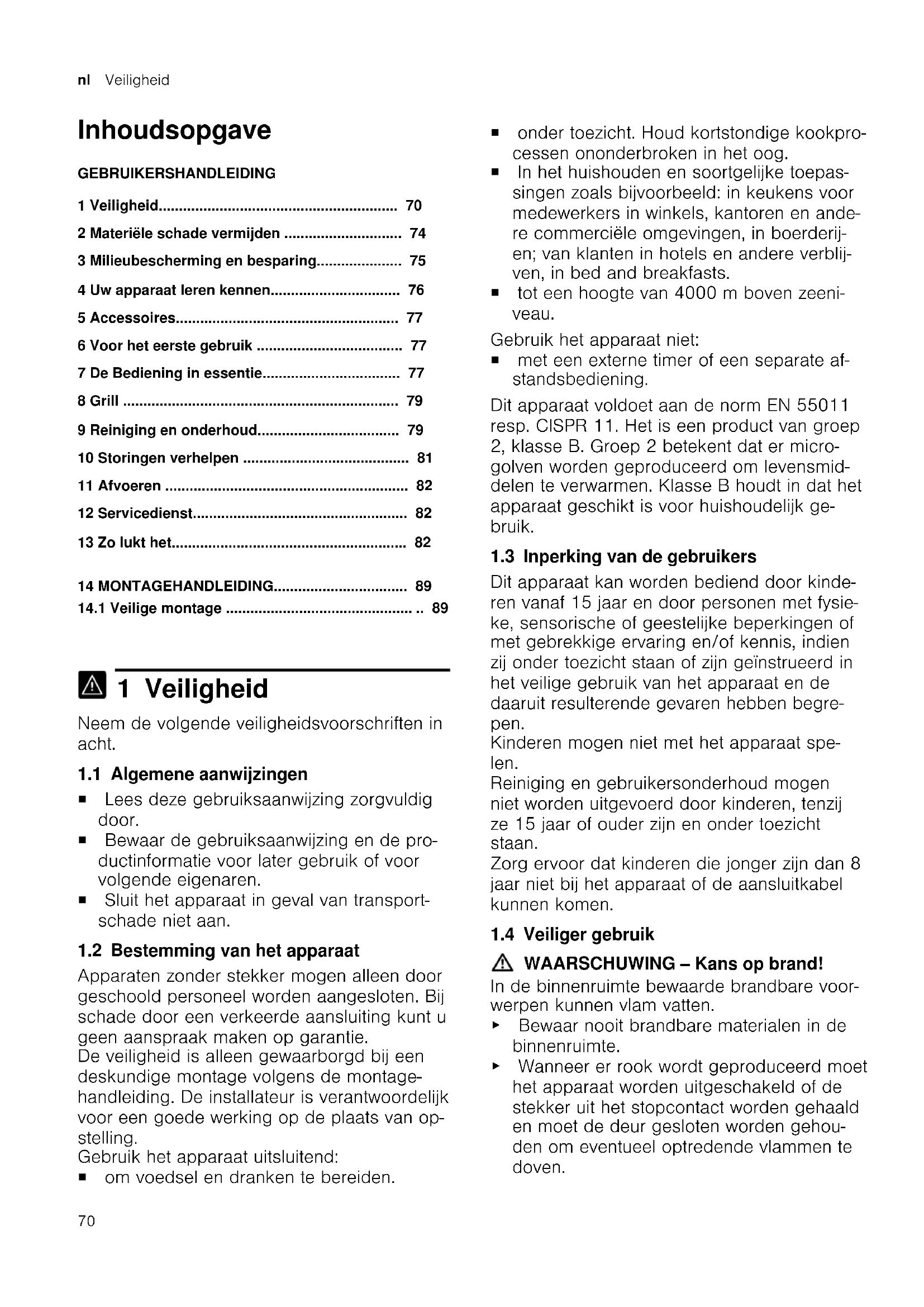 1 Veiligheid Neem de volgende veiligheidsvoorschriften in acht. 1.1 Algemene aanwijzingen ¡ Lees deze gebruiksaanwijzing zorgvuldig door. ¡ Bewaar de gebruiksaanwijzing en de pro- ductinformatie voor later gebruik of voor volgende eigenaren. ¡ Sluit het apparaat in geval van transport- schade niet aan. 1.2 Bestemming van het apparaat Apparaten zonder stekker mogen alleen door geschoold personeel worden aangesloten. Bij schade door een verkeerde aansluiting kunt u geen aanspraak maken op garantie. De veiligheid is alleen gewaarborgd bij een deskundige montage volgens de montage- handleiding. De installateur is verantwoordelijk voor een goede werking op de plaats van op- stelling. Gebruik het apparaat uitsluitend: ¡ om voedsel en dranken te bereiden. ¡ onder toezicht. Houd kortstondige kookpro- cessen ononderbroken in het oog. ¡ In het huishouden en soortgelijke toepas- singen zoals bijvoorbeeld: in keukens voor medewerkers in winkels, kantoren en ande- re commerciële omgevingen, in boerderij- en; van klanten in hotels en andere verblij- ven, in bed and breakfasts. ¡ tot een hoogte van 4000m boven zeeni- veau. Gebruik het apparaat niet: ¡ met een externe timer of een separate af- standsbediening. Dit apparaat voldoet aan de norm EN55011 resp. CISPR11. Het is een product van groep 2, klasse B. Groep 2 betekent dat er micro- golven worden geproduceerd om levensmid- delen te verwarmen. Klasse B houdt in dat het apparaat geschikt is voor huishoudelijk ge- bruik. 1.3 Inperking van de gebruikers Dit apparaat kan worden bediend door kinde- ren vanaf 15 jaar en door personen met fysie- ke, sensorische of geestelijke beperkingen of met gebrekkige ervaring en/of kennis, indien zij onder toezicht staan of zijn geïnstrueerd in het veilige gebruik van het apparaat en de daaruit resulterende gevaren hebben begre- pen. Kinderen mogen niet met het apparaat spe- len. Reiniging en gebruikersonderhoud mogen niet worden uitgevoerd door kinderen, tenzij ze 15jaar of ouder zijn en onder toezicht staan. Zorg ervoor dat kinderen die jonger zijn dan 8 jaar niet bij het apparaat of de aansluitkabel kunnen komen. 1.4 Veiliger gebruik WAARSCHUWING‒Kans op brand! In de binnenruimte bewaarde brandbare voor- werpen kunnen vlam vatten. ▶ Bewaar nooit brandbare materialen in de binnenruimte. ▶ Wanneer er rook wordt geproduceerd moet het apparaat worden uitgeschakeld of de stekker uit het stopcontact worden gehaald en moet de deur gesloten worden gehou- den om eventueel optredende vlammen te doven.Veiligheid nl