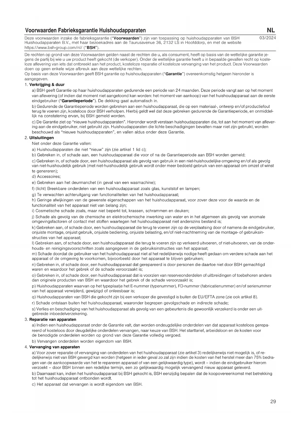 Deze voorwaarden inzake de fabrieksgarantie (“Voorwaarden”) zijn van toepassing op huishoudapparaten van BSH Huishoudapparaten B.V., met haar bezoekadres aan de Taurusavenue 36, 2132 LS in Hoofddorp, en met de website https://www.bsh-group.com/nl/ (“BSH”). 03/2024 De rechten op grond van deze Voorwaarden gelden naast de rechten die u, als consument, heeft op basis van de wettelijke garantie je- gens de partij bij wie u uw product heeft gekocht (de verkoper). Onder de wettelijke garantie heeft u in bepaalde gevallen recht op koste- loze aflevering van iets dat ontbreekt aan het product, kosteloze reparatie of kosteloze vervanging van het product. Deze Voorwaarden doen op geen enkele wijze afbreuk aan deze wettelijke rechten. Op basis van deze Voorwaarden geeft BSH garantie op huishoudapparaten (“Garantie”) overeenkomstig hetgeen hieronder is aangegeven.