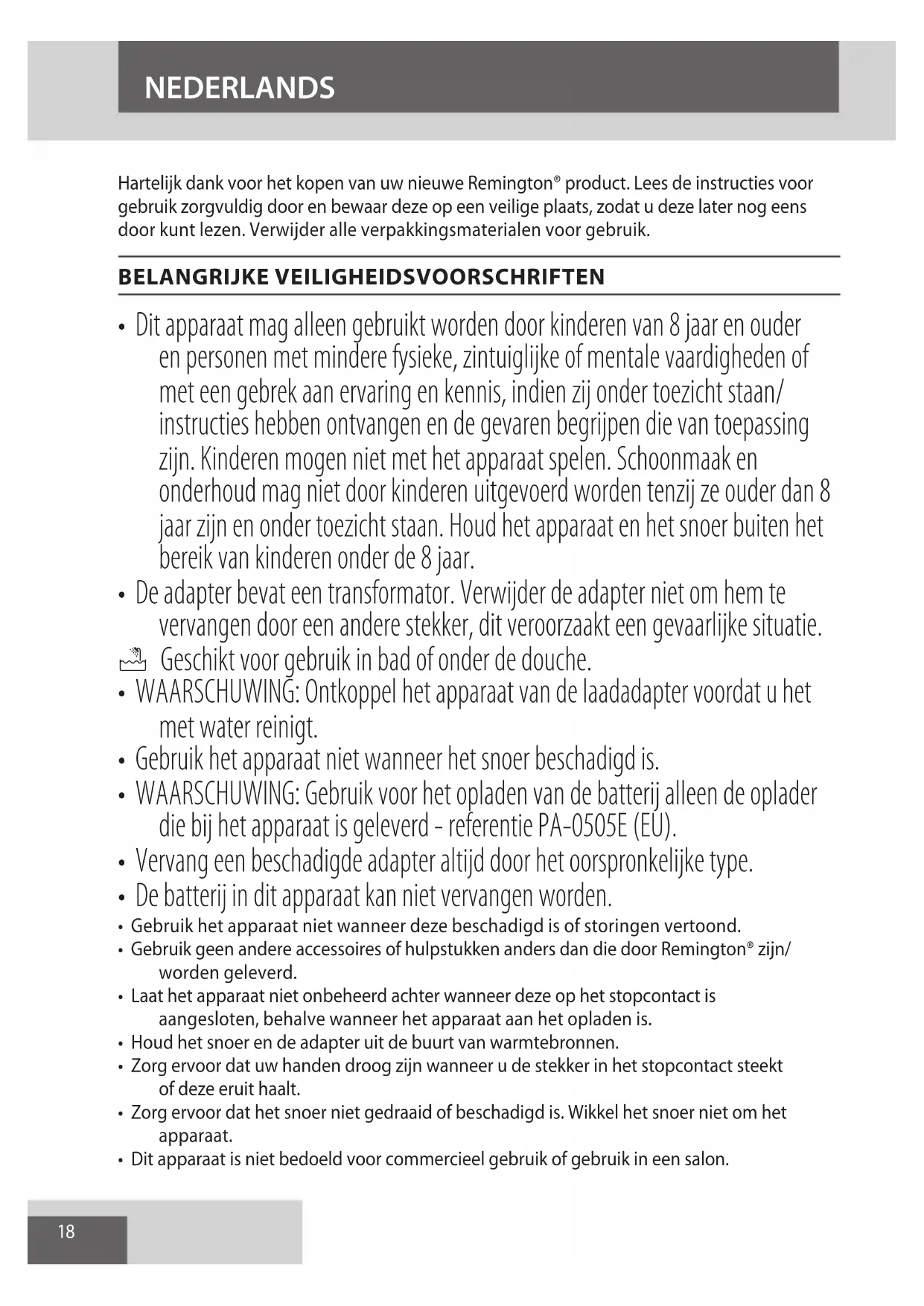 NO18 Hartelijk dank voor het kopen van uw nieuwe Remington® product. Lees de instructies voor gebruik zorgvuldig door en bewaar deze op een veilige plaats, zodat u deze later nog eens door kunt lezen. Verwijder alle verpakkingsmaterialen voor gebruik. BELANGRIJKE VEILIGHEIDSVOORSCHRIFTEN