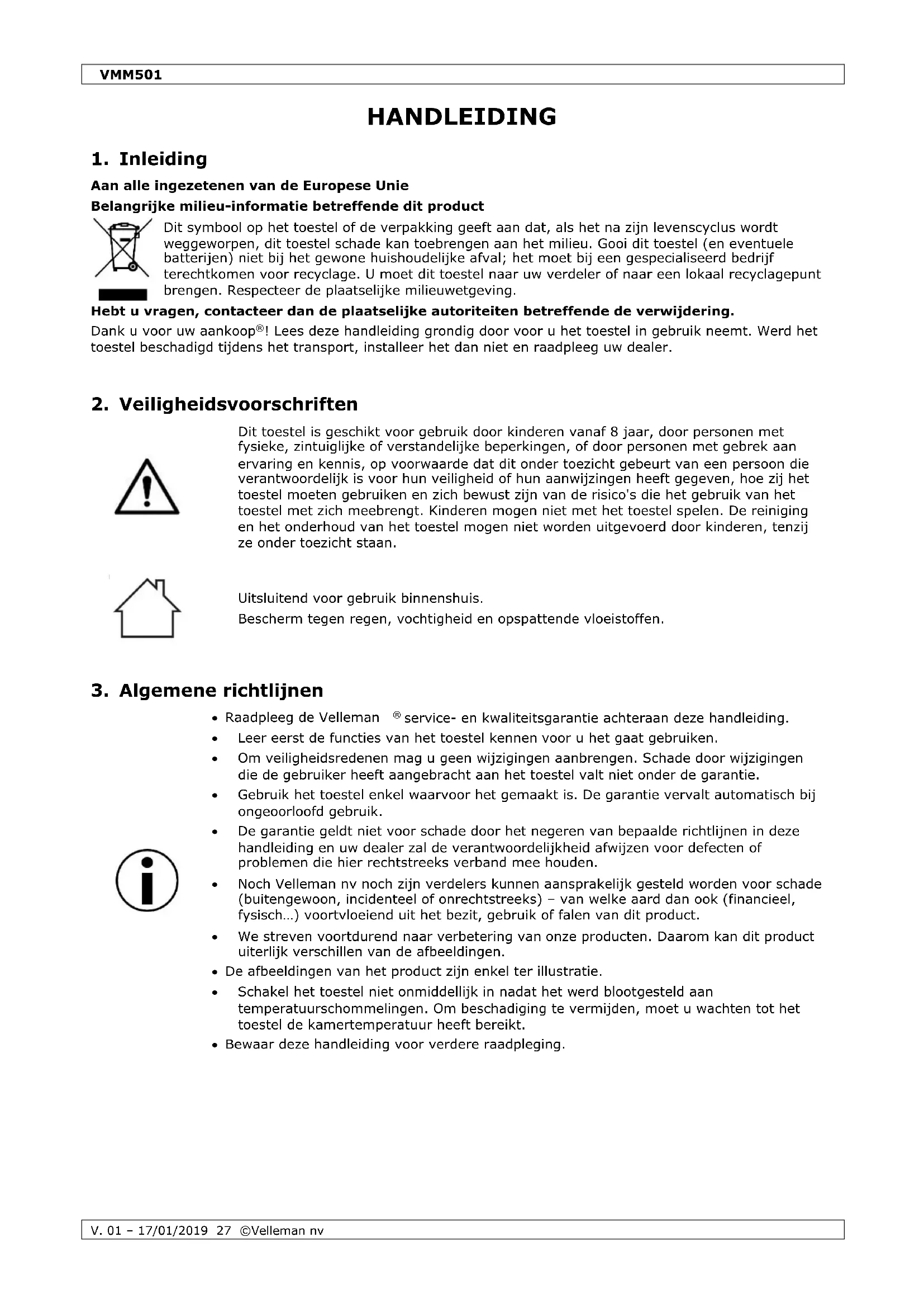 service- en kwaliteitsgarantie achteraan deze handleiding. Leer eerst de functies van het toestel kennen voor u het gaat gebruiken. Om veiligheidsredenen mag u geen wijzigingen aanbrengen. Schade door wijzigingen die de gebruiker heeft aangebracht aan het toestel valt niet onder de garantie. Gebruik het toestel enkel waarvoor het gemaakt is. De garantie vervalt automatisch bij ongeoorloofd gebruik. De garantie geldt niet voor schade door het negeren van bepaalde richtlijnen in deze handleiding en uw dealer zal de verantwoordelijkheid afwijzen voor defecten of problemen die hier rechtstreeks verband mee houden. Noch Velleman nv noch zijn verdelers kunnen aansprakelijk gesteld worden voor schade (buitengewoon, incidenteel of onrechtstreeks) – van welke aard dan ook (financieel, fysisch…) voortvloeiend uit het bezit, gebruik of falen van dit product. We streven voortdurend naar verbetering van onze producten. Daarom kan dit product uiterlijk verschillen van de afbeeldingen. De afbeeldingen van het product zijn enkel ter illustratie. Schakel het toestel niet onmiddellijk in nadat het werd blootgesteld aan temperatuurschommelingen. Om beschadiging te vermijden, moet u wachten tot het toestel de kamertemperatuur heeft bereikt. Bewaar deze handleiding voor verdere raadpleging.VMM501