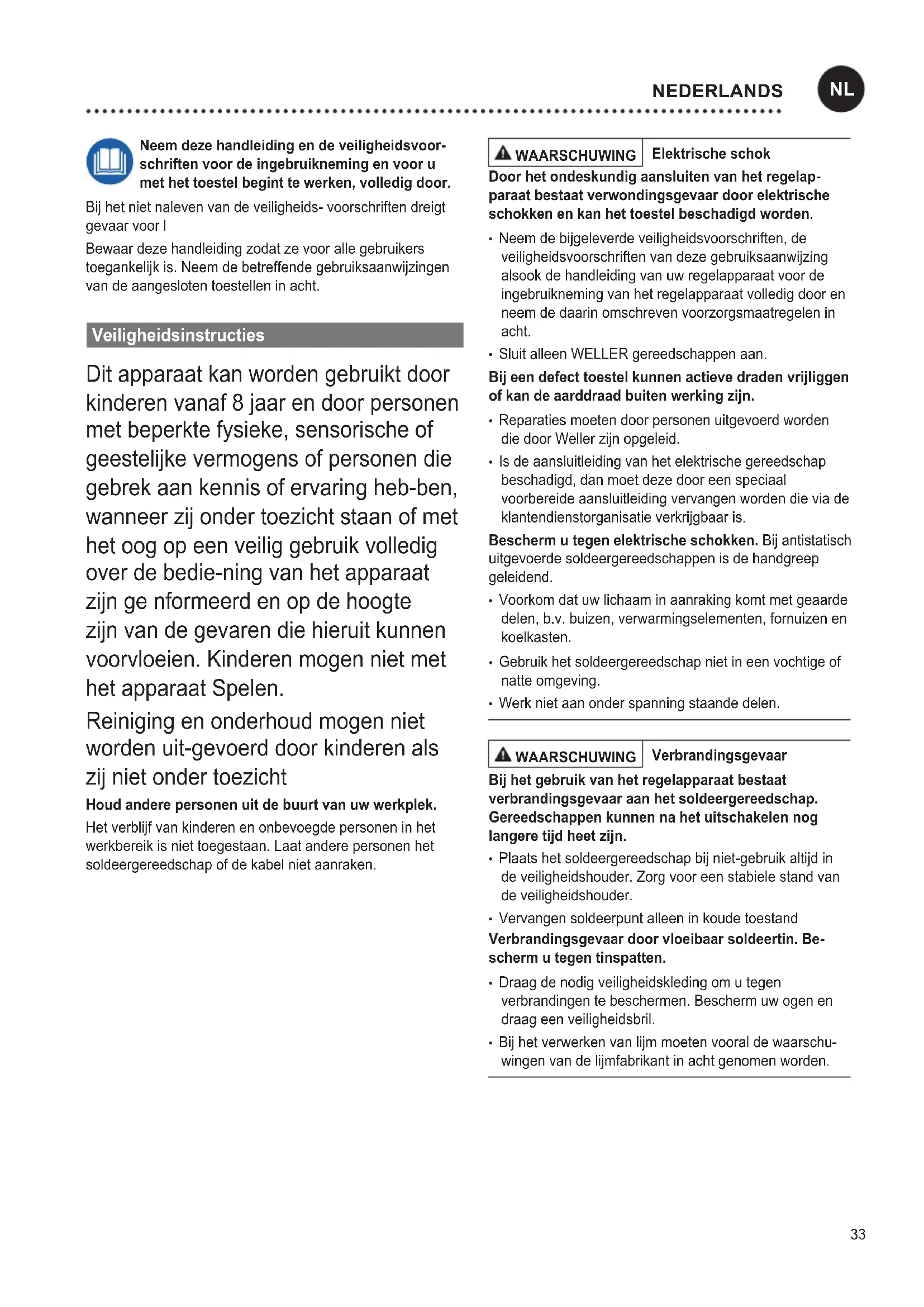 Neem deze handleiding en de veiligheidsvoor- schriften voor de ingebruikneming en voor u met het toestel begint te werken, volledig door. Bij het niet naleven van de veiligheids- voorschriften dreigt gevaar voor l Bewaar deze handleiding zodat ze voor alle gebruikers toegankelijk is. Neem de betreffende gebruiksaanwijzingen van de aangesloten toestellen in acht. Veiligheidsinstructies Dit apparaat kan worden gebruikt door kinderen vanaf 8 jaar en door personen metbeperktefysieke,sensorischeof geestelijke vermogens of personen die gebrek aan kennis of ervaring heb-ben, wanneer zij onder toezicht staan of met het oog op een veilig gebruik volledig over de bedie-ning van het apparaat zijn ge nformeerd en op de hoogte zijn van de gevaren die hieruit kunnen voorvloeien. Kinderen mogen niet met het apparaat Spelen. Reiniging en onderhoud mogen niet worden uit-gevoerd door kinderen als zij niet onder toezicht Houd andere personen uit de buurt van uw werkplek. Het verblijf van kinderen en onbevoegde personen in het werkbereik is niet toegestaan. Laat andere personen het soldeergereedschap of de kabel niet aanraken. WAARSCHUWING Elektrische schok Door het ondeskundig aansluiten van het regelap- paraat bestaat verwondingsgevaar door elektrische schokken en kan het toestel beschadigd worden.