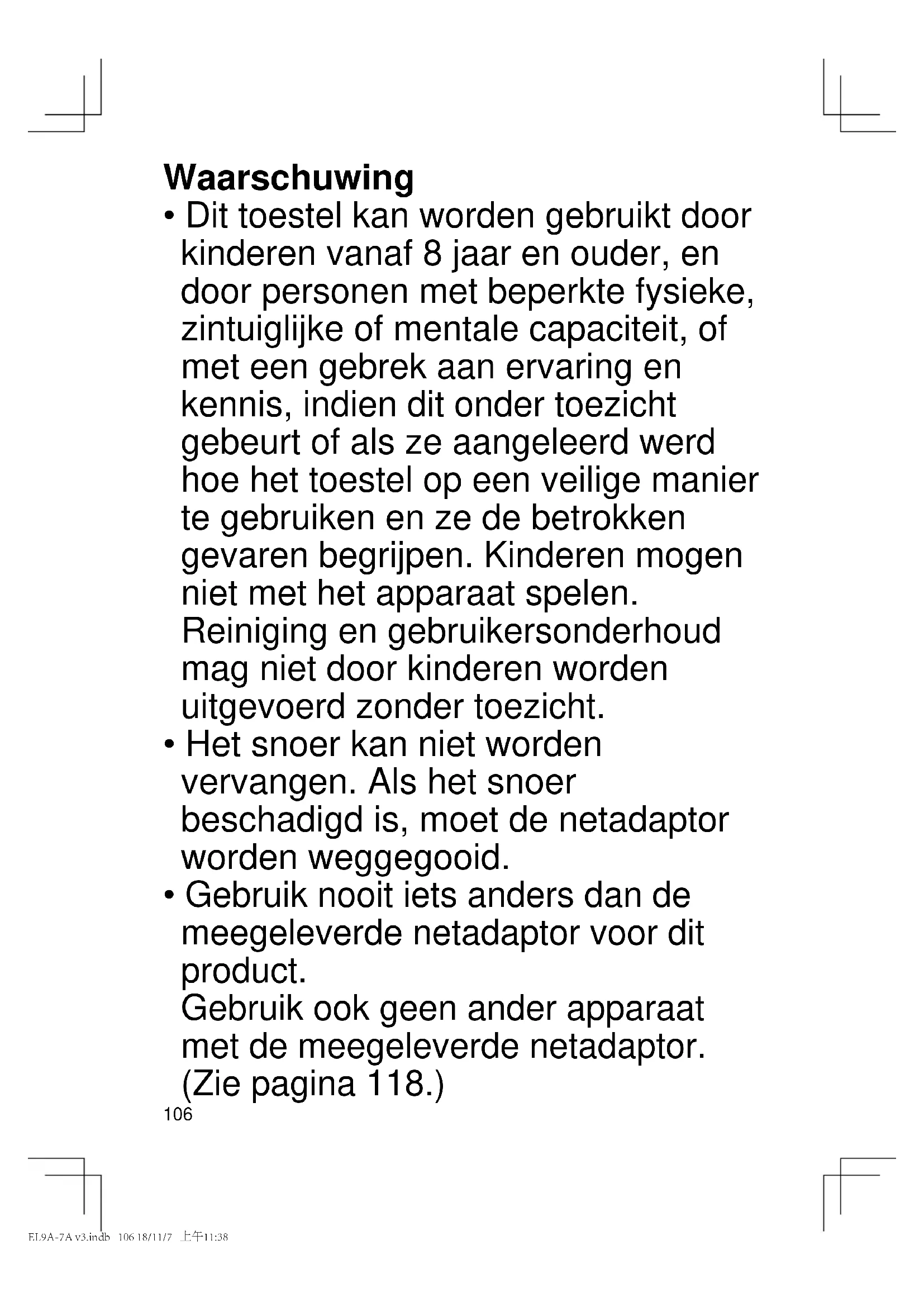 Dit kan duizeligheid veroorzaken. Laat het apparaat niet vallen en stel het niet bloot aan schokken ‑ Dit kan letsel veroorzaken. Wikkel het netsnoer bij het opbergen niet rond de adapter of het apparaat ‑ Dit kan de draad in het netsnoer door de belasting doen breken en brand veroorzaken door kortsluiting. Trek de adapter of apparaatstekker uit het stopcontact door hem de adapter of apparaatstekker vast te pakken in plaats van het netsnoer ‑ Het afkoppelen door middel van het vastpakken van het snoer kan tot een elektrische schok of letsel leiden. Trek de stekker van de adapter altijd uit het stopcontact wanneer het apparaat niet wordt opgeladen ‑ Anders kan dit elektrische schok of brand veroorzaken, door elektrische lekkage als gevolg van beschadiging van de isolatie. EL9A-7A v3.indb 115 18/11/7 上午11:38116 WAARSCHUWING Na het verwijderen van de oplaadbare batterij, moet deze buiten het bereik van kinderen en peuters worden bewaard ‑ De batterij is schadelijk voor het lichaam als deze per ongeluk wordt ingeslikt. Als dit gebeurt, raadpleeg dan onmiddellijk een arts. Als de batterij lekt en de vloeistof in aanraking komt met de ogen, moet u niet in de ogen wrijven maar grondig spoelen met schoon water, zoals kraanwater