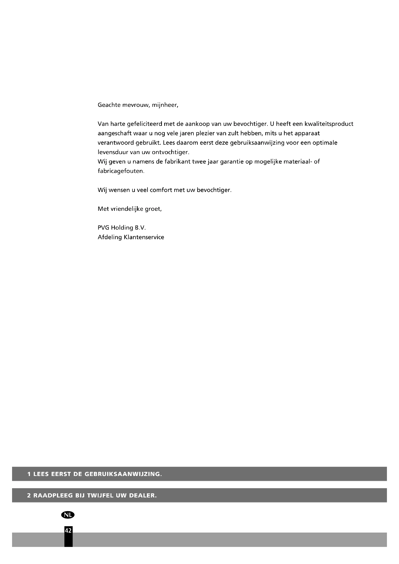 Geachte mevrouw, mijnheer, Van harte gefeliciteerd met de aankoop van uw bevochtiger. U heeft een kwaliteitsproduct aangeschaft waar u nog vele jaren plezier van zult hebben, mits u het apparaat verantwoord gebruikt. Lees daarom eerst deze gebruiksaanwijzing voor een optimale levensduur van uw ontvochtiger. Wij geven u namens de fabrikant twee jaar garantie op mogelijke materiaal- of fabricagefouten. Wij wensen u veel comfort met uw bevochtiger. Met vriendelijke groet, PVG Holding B.V. Afdeling KlantenserviceBELANGRIJKE ONDERDELEN Bedieningspaneel Uitlaat van droge lucht Uitneembaar waterreservoir Inlaat van vochtige lucht Luchtfilter Afvoertuit (ø 13 mm) met dop Zwenkwieltje Stekker en snoer Handvat