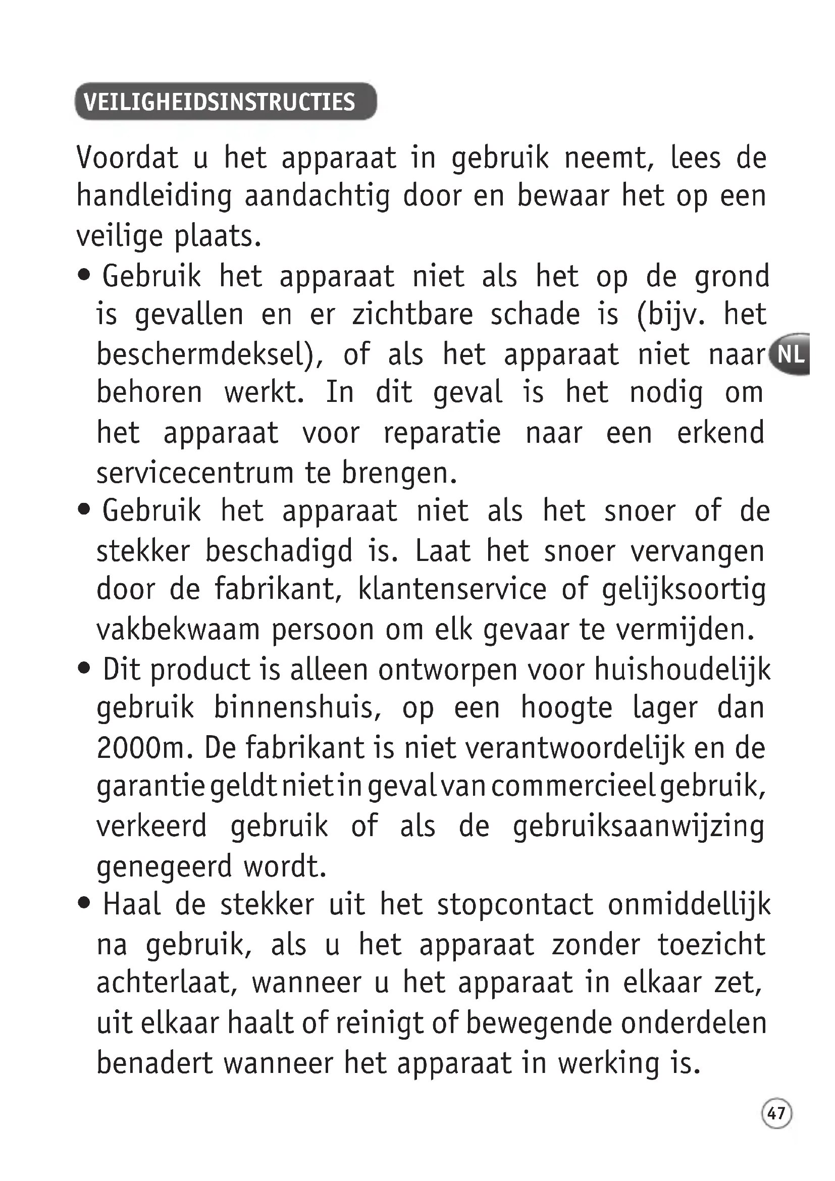 VEILIGHEIDSINSTRUCTIES Voordat u het apparaat in gebruik neemt, lees de handleiding aandachtig door en bewaar het op een veilige plaats.