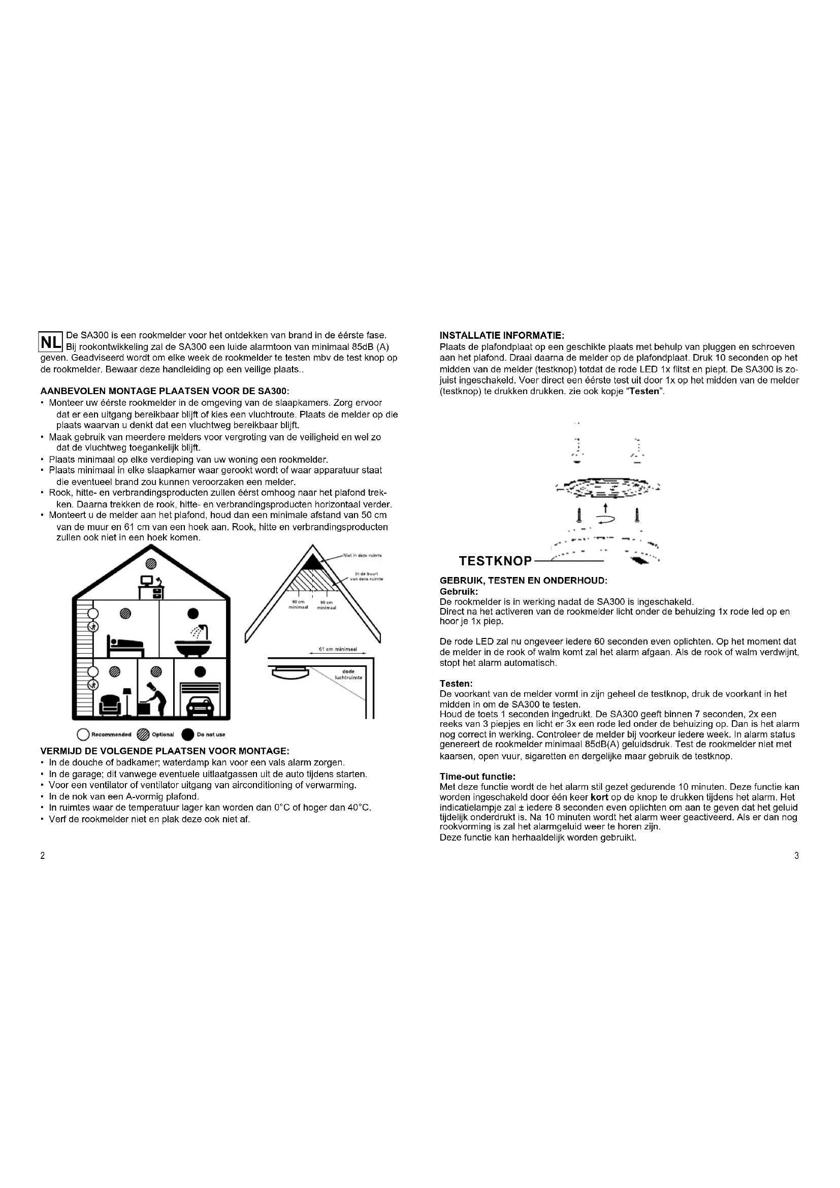 SA300 Rookmelder voor gebruik in huiselijke omgeving Détecteur de fumée pour l’usage dans l’entourage domestique Rauchmelder zum Gebrauch im Heimbereich Smoke detector for domestic use Detector de humo para uso en el hogar2 3 De SA300 is een rookmelder voor het ontdekken van brand in de éérste fase. Bij rookontwikkeling zal de SA300 een luide alarmtoon van minimaal 85dB (A) geven. Geadviseerd wordt om elke week de rookmelder te testen mbv de test knop op de rookmelder. Bewaar deze handleiding op een veilige plaats.. AANBEVOLEN MONTAGE PLAATSEN VOOR DE SA300: