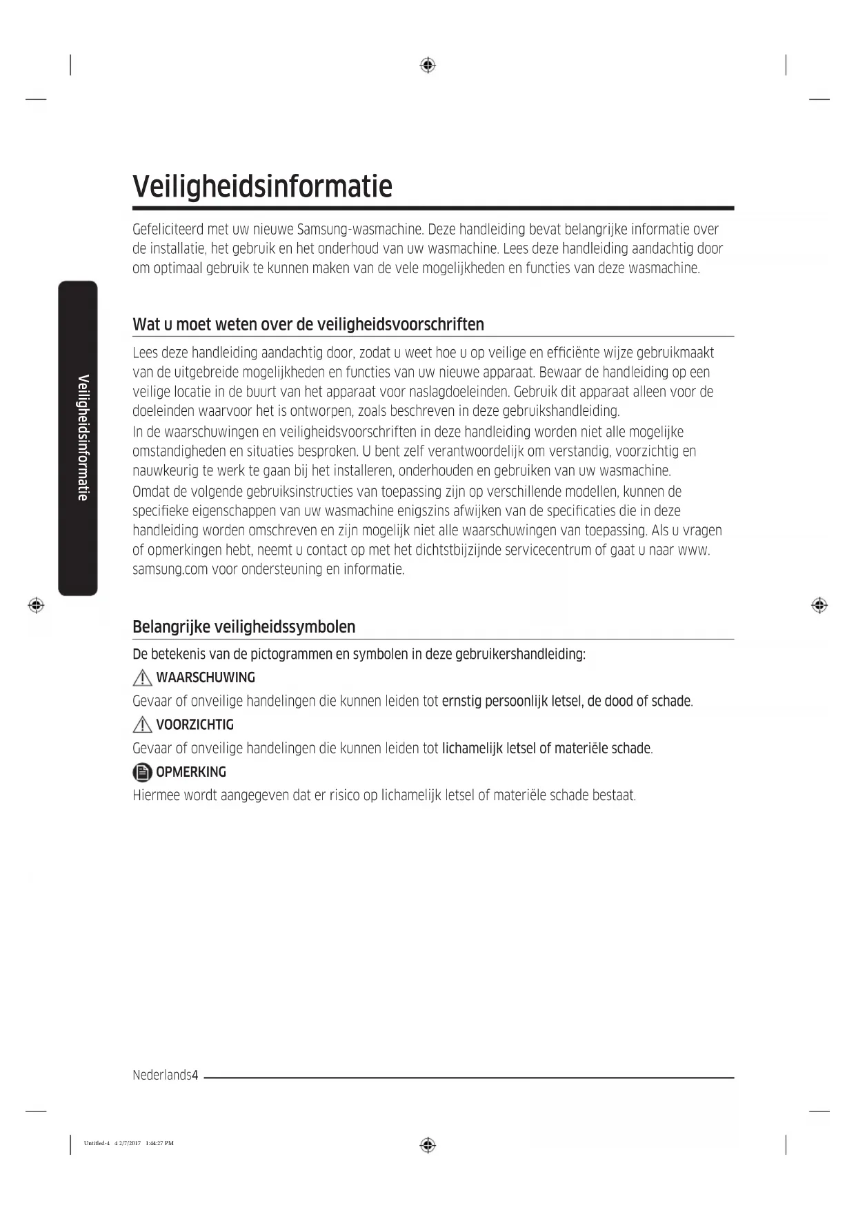 Nederlands4 Veiligheidsinformatie Gefeliciteerd met uw nieuwe Samsung-wasmachine. Deze handleiding bevat belangrijke informatie over de installatie, het gebruik en het onderhoud van uw wasmachine. Lees deze handleiding aandachtig door om optimaal gebruik te kunnen maken van de vele mogelijkheden en functies van deze wasmachine. Wat u moet weten over de veiligheidsvoorschriften Lees deze handleiding aandachtig door, zodat u weet hoe u op veilige en efciënte wijze gebruikmaakt van de uitgebreide mogelijkheden en functies van uw nieuwe apparaat. Bewaar de handleiding op een veilige locatie in de buurt van het apparaat voor naslagdoeleinden. Gebruik dit apparaat alleen voor de doeleinden waarvoor het is ontworpen, zoals beschreven in deze gebruikshandleiding. In de waarschuwingen en veiligheidsvoorschriften in deze handleiding worden niet alle mogelijke omstandigheden en situaties besproken. U bent zelf verantwoordelijk om verstandig, voorzichtig en nauwkeurig te werk te gaan bij het installeren, onderhouden en gebruiken van uw wasmachine. Omdat de volgende gebruiksinstructies van toepassing zijn op verschillende modellen, kunnen de specieke eigenschappen van uw wasmachine enigszins afwijken van de specicaties die in deze handleiding worden omschreven en zijn mogelijk niet alle waarschuwingen van toepassing. Als u vragen of opmerkingen hebt, neemt u contact op met het dichtstbijzijnde servicecentrum of gaat u naar www. samsung.com voor ondersteuning en informatie. Belangrijke veiligheidssymbolen De betekenis van de pictogrammen en symbolen in deze gebruikershandleiding: WAARSCHUWING Gevaar of onveilige handelingen die kunnen leiden tot ernstig persoonlijk letsel, de dood of schade. VOORZICHTIG Gevaar of onveilige handelingen die kunnen leiden tot lichamelijk letsel of materiële schade. OPMERKING Hiermee wordt aangegeven dat er risico op lichamelijk letsel of materiële schade bestaat. Veiligheidsinformatie Untitled-4 4 2/7/2017 1:44:27 PMNederlands 5 Veiligheidsinformatie Deze waarschuwingstekens dienen om lichamelijk letsel bij uzelf en bij anderen te voorkomen. Voer de aanwijzingen nauwgezet uit. Bewaar deze handleiding na het lezen op een veilige plek voor naslagdoeleinden. Lees alle instructies voordat u het apparaat in gebruik neemt. Zoals geldt voor alle elektrische apparatuur met bewegende delen bestaat er een mogelijk gebruiksrisico. Om dit apparaat veilig te kunnen gebruiken, dient u vertrouwd te raken met de bediening en voorzichtig te zijn bij het gebruik ervan. Belangrijke veiligheidsvoorschriften WAARSCHUWING Om de kans op brand, elektrische schokken of lichamelijk letsel bij het gebruik van het apparaat te verminderen, dient u deze algemene veiligheidsvoorschriften te volgen: