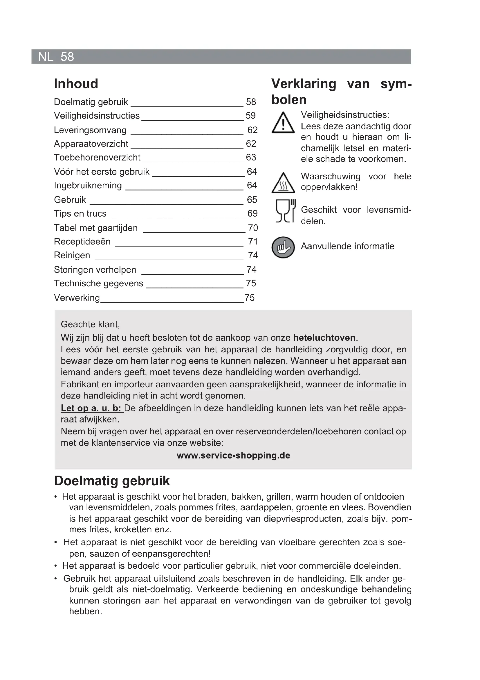 Het apparaat is geen friteuse waarin met olie levensmiddelen worden gefrituurd. Het apparaat werkt met hete lucht! Vul beschotel Niet met grotere hoeveelheden olie of frituurvet!