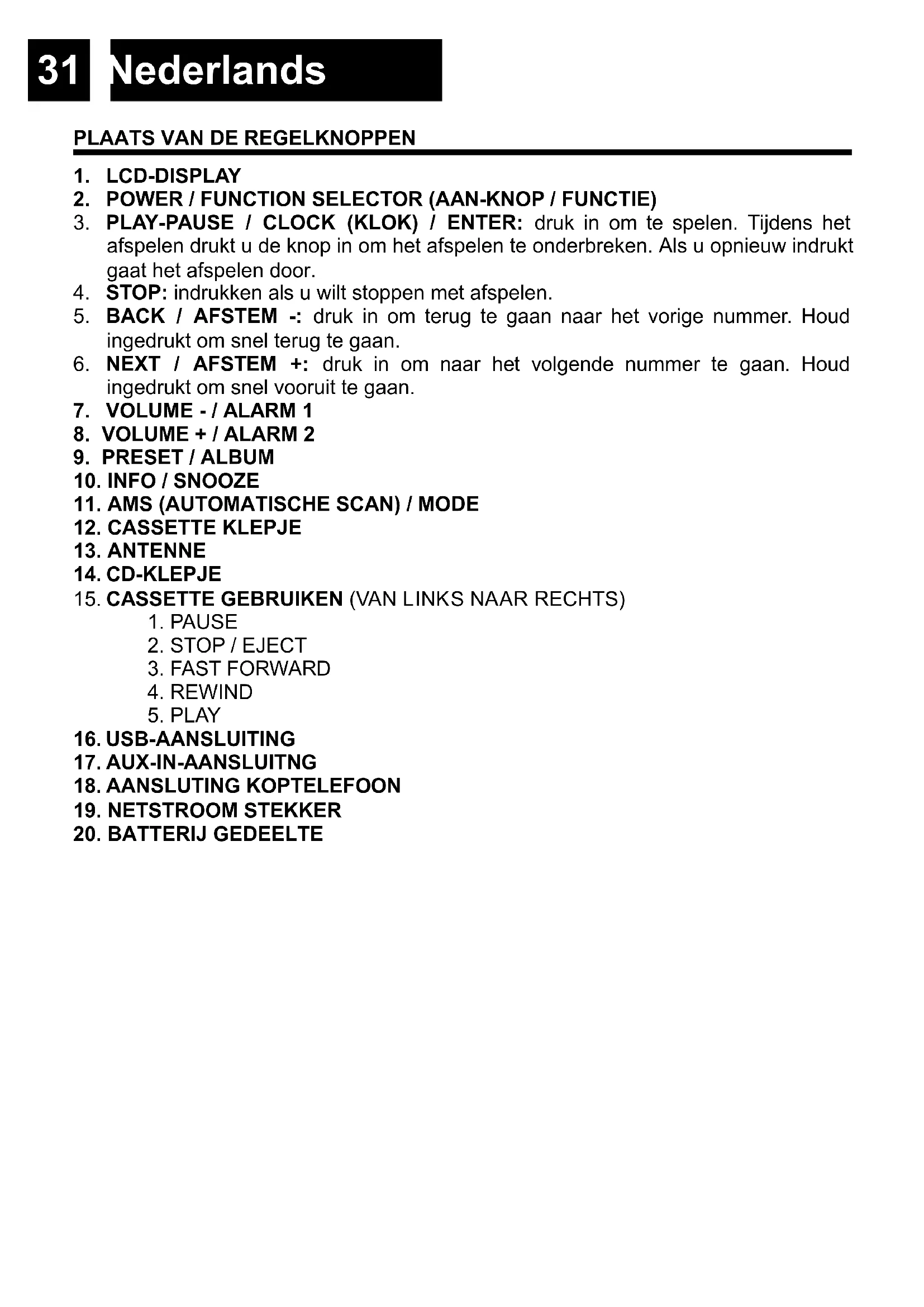 3. PLAY-PAUSE / CLOCK (KLOK) / ENTER: druk in om te spelen. Tijdens het