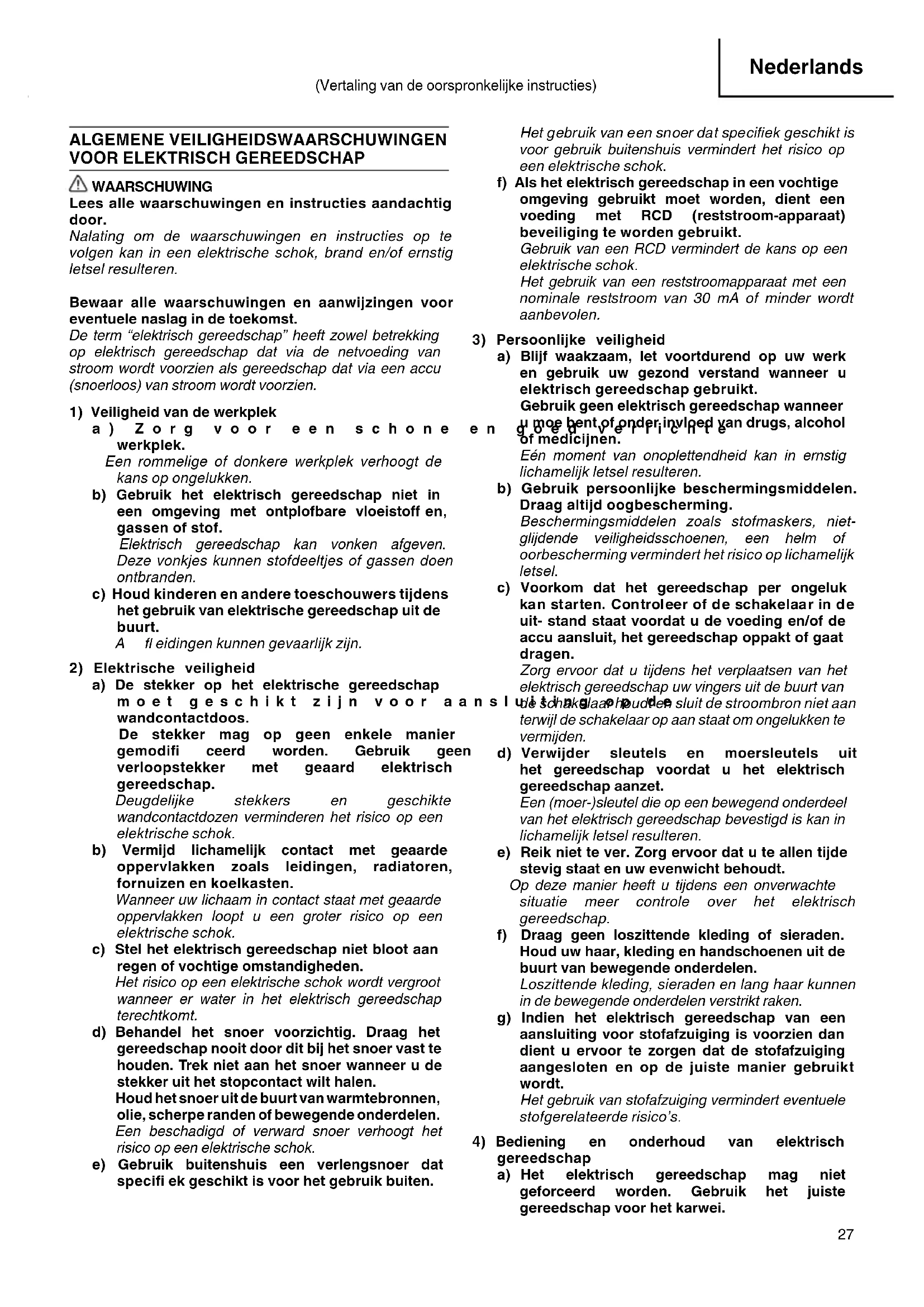 WAARSCHUWING Lees alle waarschuwingen en instructies aandachtig door. Nalating om de waarschuwingen en instructies op te volgen kan in een elektrische schok, brand en/of ernstig letsel resulteren. Bewaar alle waarschuwingen en aanwijzingen voor eventuele naslag in de toekomst. De term “elektrisch gereedschap” heeft zowel betrekking op elektrisch gereedschap dat via de netvoeding van stroom wordt voorzien als gereedschap dat via een accu (snoerloos) van stroom wordt voorzien.