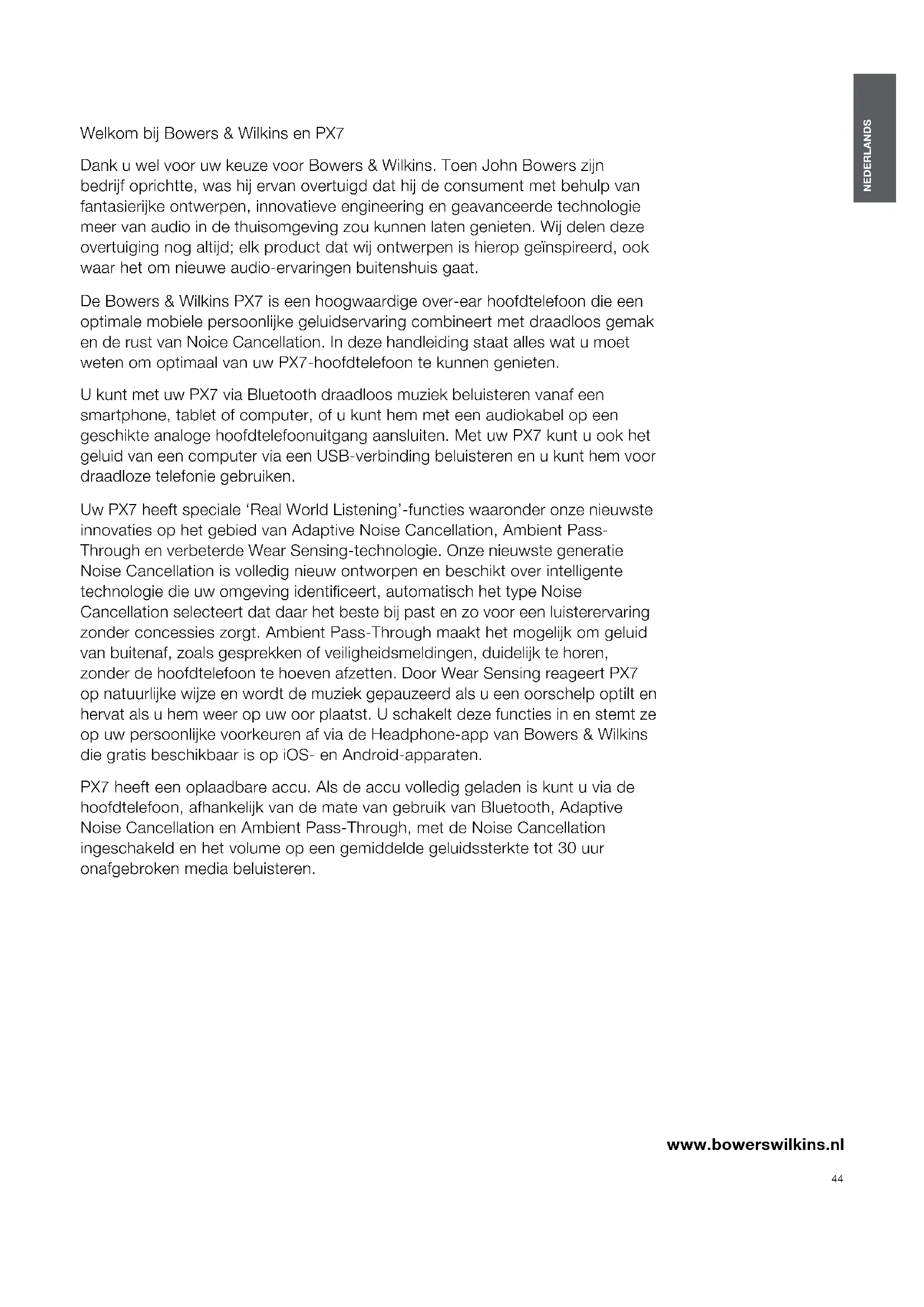 Per un ulteriore aiuto o consigli sulla PX7, consultare le pagine dedicate all’assistenza: www.bowerswilkins.com/it-it/support Informazioni per l’ambiente Questo prodotto è realizzato in conformità alle normative internazionali sulla limitazione delle sostanze pericolose (RoHS) come pure sulla registrazione, valutazione, autorizzazione e limitazione delle sostanze chimiche (REACH) e sullo smaltimento delle apparecchiature elettriche ed elettroniche (WEEE). Fare riferimento alle indicazioni dell’autorità del vostro Paese per il corretto riciclo o smaltimento del prodotto.43 ITALIANO Caratteristiche tecniche Tipo Cufe circumaurali Bluetooth senza li Caratteristiche tecniche Cancellazione adattiva del rumore Passaggio rumori ambientali Sensori di rilevamento posizione Bluetooth® audio – Bluetooth 5.0 con aptX™ Adaptive Presa USB-C per ricarica & interfaccia audio Presa mini-jack 3,5 mm per collegamento via cavo Codec Bluetooth aptX™ Adaptive aptX™ HD aptX™ Classic AAC SBC Proli Bluetooth A2DP v1.3.1 AVRCP v1.6.1 HFP v1.7.1 HSP v1.2 BLE GATT (Prolo di Attributo Generico) Trasduttori 2 x 43,6 mm ø a gamma intera Microfoni 4 per cancellazione rumore 2 per telefonia (CVC2 – Clear Voice Communication v2) Gamma di frequenze 10 Hz – 30 kHz Impedenza d’ingresso 20 kohm Distorsione (THD) <0,3% (1 kHz/10 mW) Batteria Ricaricabile ai polimeri di litio Durata della batteria 30 ore streaming Bluetooth + cancellazione rumore, 5 ore con 15 min di ricarica Ingressi Bluetooth, mini-jack stereo 3,5 mm, USB-C audio Accessori in dotazione Cavo audio con mini-jack stereo da 1,2 m, cavo USB-A > USB-C da 1,2 m, custodia protettiva Peso 310 g44 NEDERLANDS www.bowerswilkins.nl Welkom bij Bowers & Wilkins en PX7 Dank u wel voor uw keuze voor Bowers & Wilkins. Toen John Bowers zijn bedrijf oprichtte, was hij ervan overtuigd dat hij de consument met behulp van fantasierijke ontwerpen, innovatieve engineering en geavanceerde technologie meer van audio in de thuisomgeving zou kunnen laten genieten. Wij delen deze overtuiging nog altijd; elk product dat wij ontwerpen is hierop geïnspireerd, ook waar het om nieuwe audio-ervaringen buitenshuis gaat. De Bowers & Wilkins PX7 is een hoogwaardige over-ear hoofdtelefoon die een optimale mobiele persoonlijke geluidservaring combineert met draadloos gemak en de rust van Noice Cancellation. In deze handleiding staat alles wat u moet weten om optimaal van uw PX7-hoofdtelefoon te kunnen genieten. U kunt met uw PX7 via Bluetooth draadloos muziek beluisteren vanaf een smartphone, tablet of computer, of u kunt hem met een audiokabel op een geschikte analoge hoofdtelefoonuitgang aansluiten. Met uw PX7 kunt u ook het geluid van een computer via een USB-verbinding beluisteren en u kunt hem voor draadloze telefonie gebruiken. Uw PX7 heeft speciale ‘Real World Listening’-functies waaronder onze nieuwste innovaties op het gebied van Adaptive Noise Cancellation, Ambient Pass- Through en verbeterde Wear Sensing-technologie. Onze nieuwste generatie Noise Cancellation is volledig nieuw ontworpen en beschikt over intelligente technologie die uw omgeving identiceert, automatisch het type Noise Cancellation selecteert dat daar het beste bij past en zo voor een luisterervaring zonder concessies zorgt. Ambient Pass-Through maakt het mogelijk om geluid van buitenaf, zoals gesprekken of veiligheidsmeldingen, duidelijk te horen, zonder de hoofdtelefoon te hoeven afzetten. Door Wear Sensing reageert PX7 op natuurlijke wijze en wordt de muziek gepauzeerd als u een oorschelp optilt en hervat als u hem weer op uw oor plaatst. U schakelt deze functies in en stemt ze op uw persoonlijke voorkeuren af via de Headphone-app van Bowers & Wilkins die gratis beschikbaar is op iOS- en Android-apparaten. PX7 heeft een oplaadbare accu. Als de accu volledig geladen is kunt u via de hoofdtelefoon, afhankelijk van de mate van gebruik van Bluetooth, Adaptive Noise Cancellation en Ambient Pass-Through, met de Noise Cancellation ingeschakeld en het volume op een gemiddelde geluidssterkte tot 30 uur onafgebroken media beluisteren. NEDERLANDS Contents NEDERLANDS 2