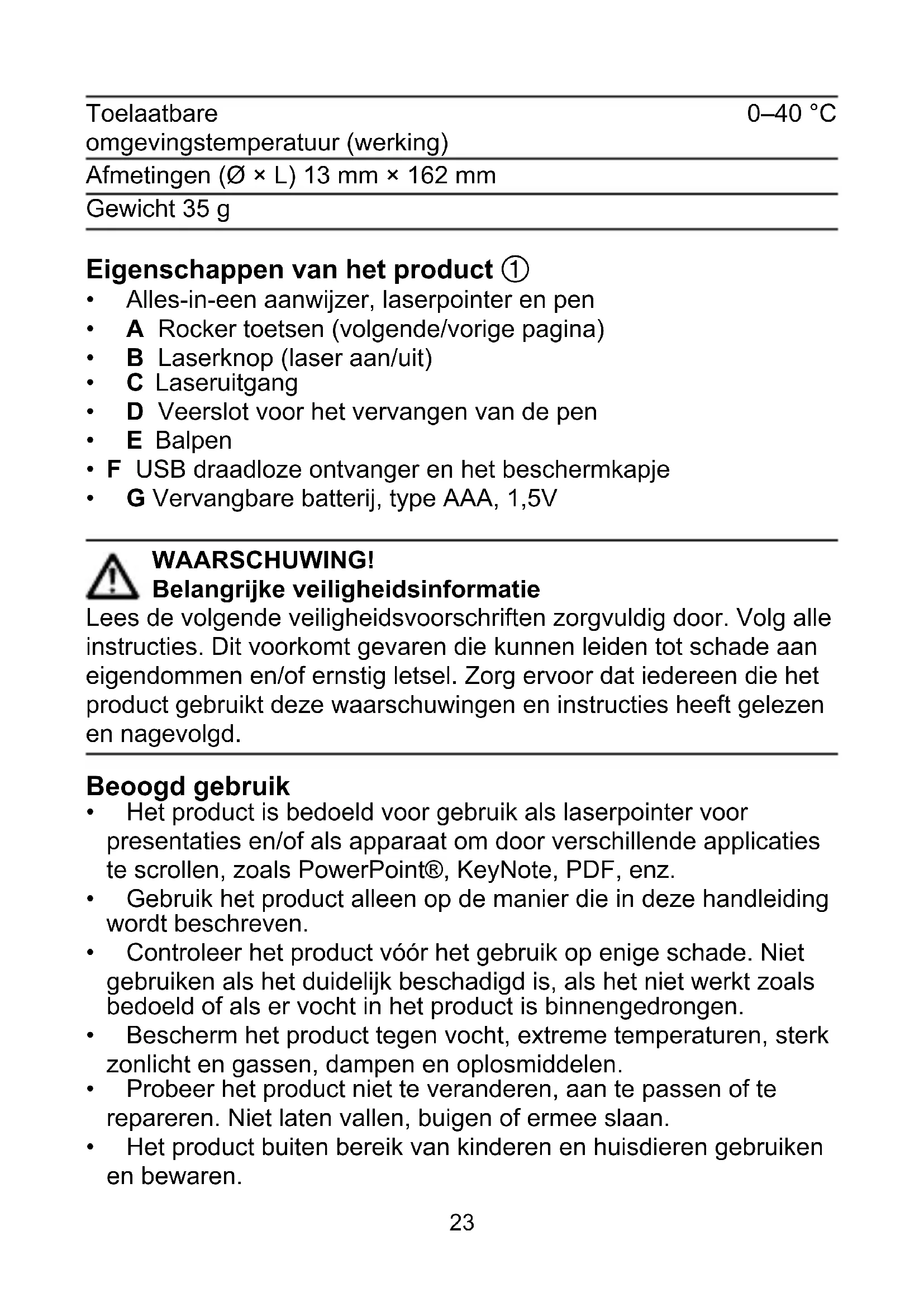 - G Vervangbare batterij, type AAA, 1,5V WAARSCHUWING! Belangrijke veiligheidsinformatie Lees de volgende veiligheidsvoorschriften zorgvuldig door. Volg alle instructies. Dit voorkomt gevaren die kunnen leiden tot schade aan eigendommen en/of ernstig letsel. Zorg ervoor dat iedereen die het product gebruikt deze waarschuwingen en instructies heeft gelezen en nagevolgd. Beoogd gebruik