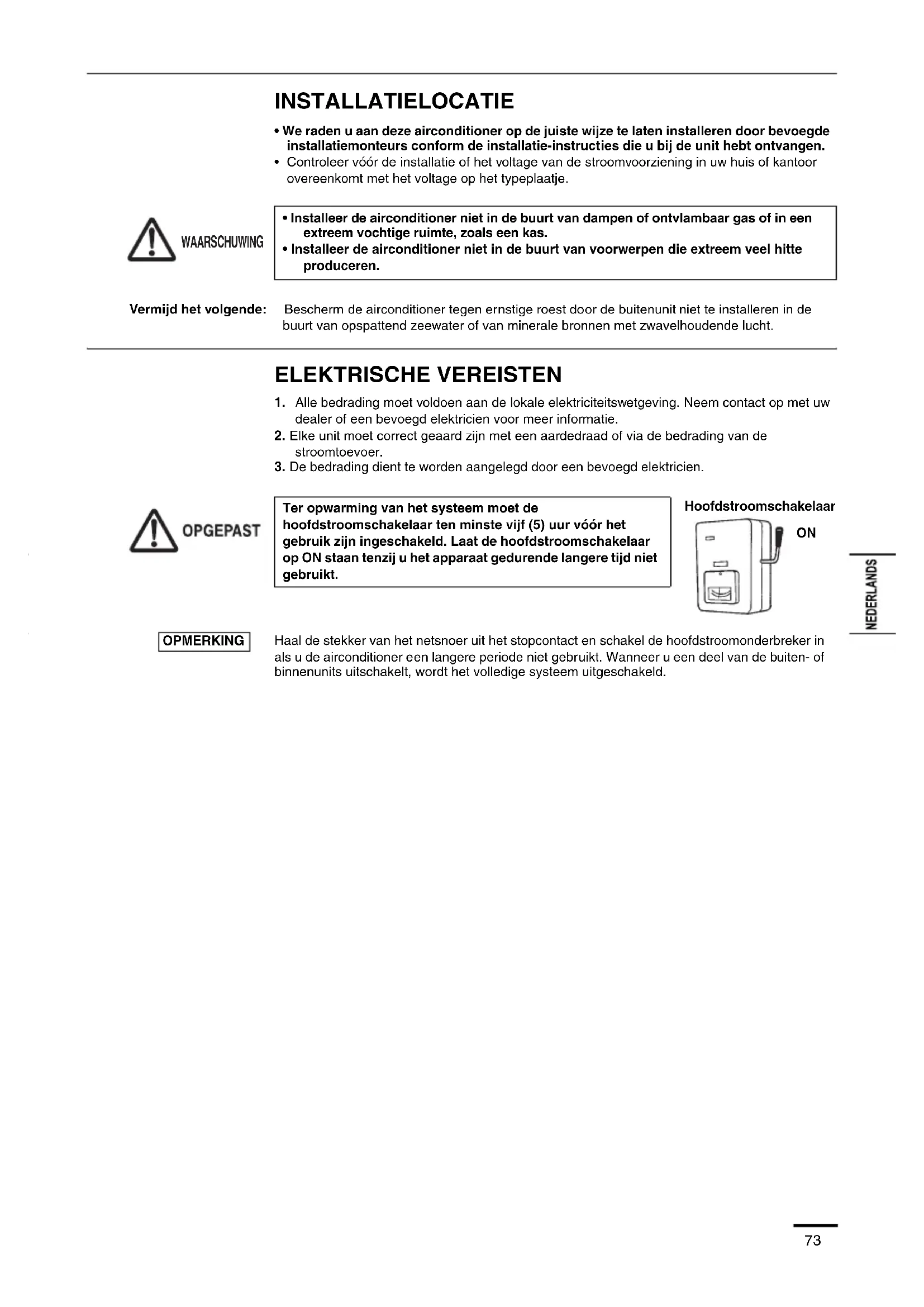 - Installeer de airconditioner niet in de buurt van voorwerpen die extreem veel hitte produceren. Vermijd het volgende: Bescherm de airconditioner tegen ernstige roest door de buitenunit niet te installeren in de buurt van opspattend zeewater of van minerale bronnen met zwavelhoudende lucht. Ter opwarming van het systeem moet de hoofdstroomschakelaar ten minste vijf (5) uur vóór het gebruik zijn ingeschakeld. Laat de hoofdstroomschakelaar op ON staan tenzij u het apparaat gedurende langere tijd niet gebruikt. Haal de stekker van het netsnoer uit het stopcontact en schakel de hoofdstroomonderbreker in als u de airconditioner een langere periode niet gebruikt. Wanneer u een deel van de buiten- of binnenunits uitschakelt, wordt het volledige systeem uitgeschakeld. WAARSCHUWING Hoofdstroomschakelaar