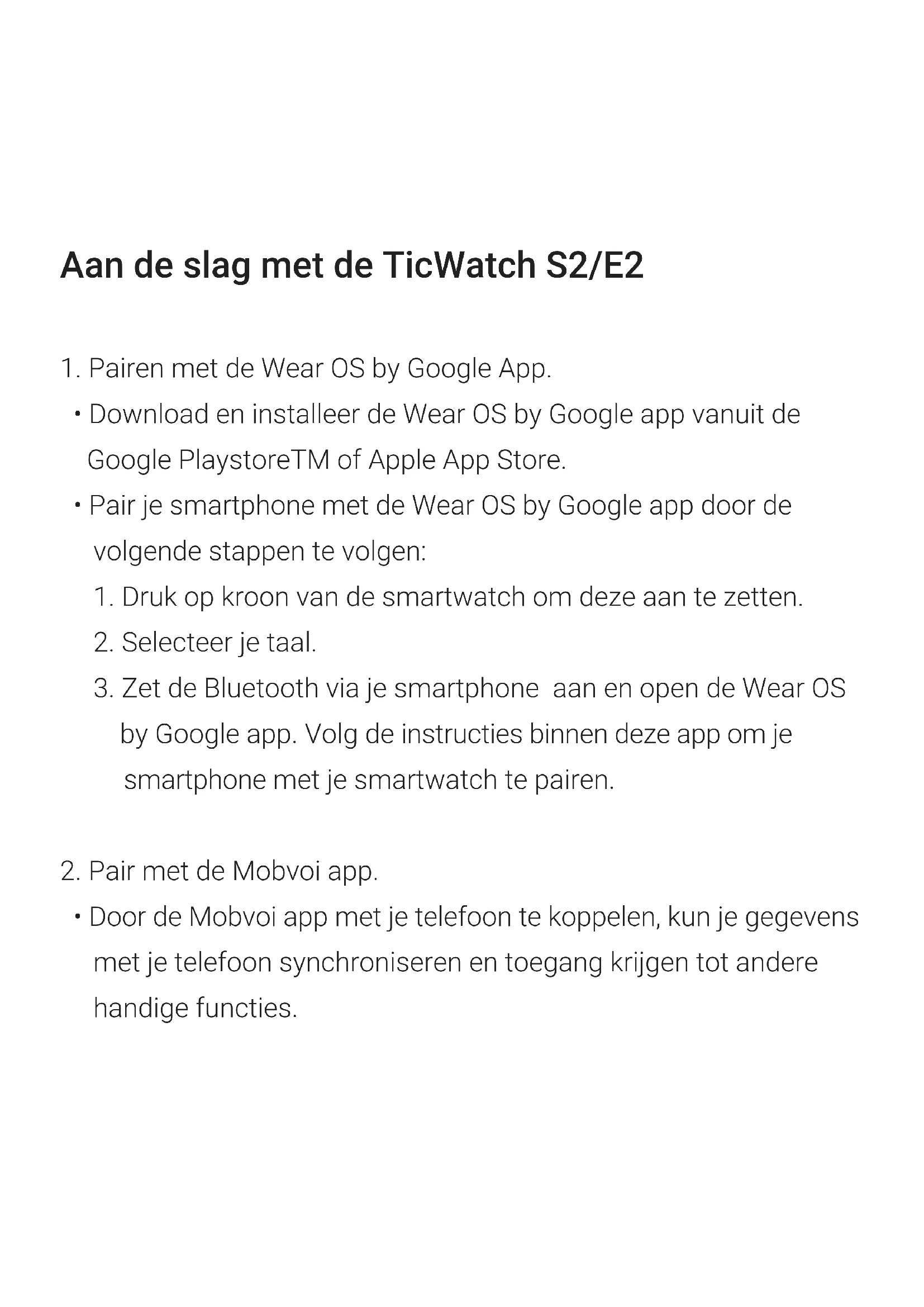 van de Wear OS by Google app. Wanneer dit succesvol is pair je met de Mobvoi app. Volg deze stappen ook niet via de Bluetooth interface.