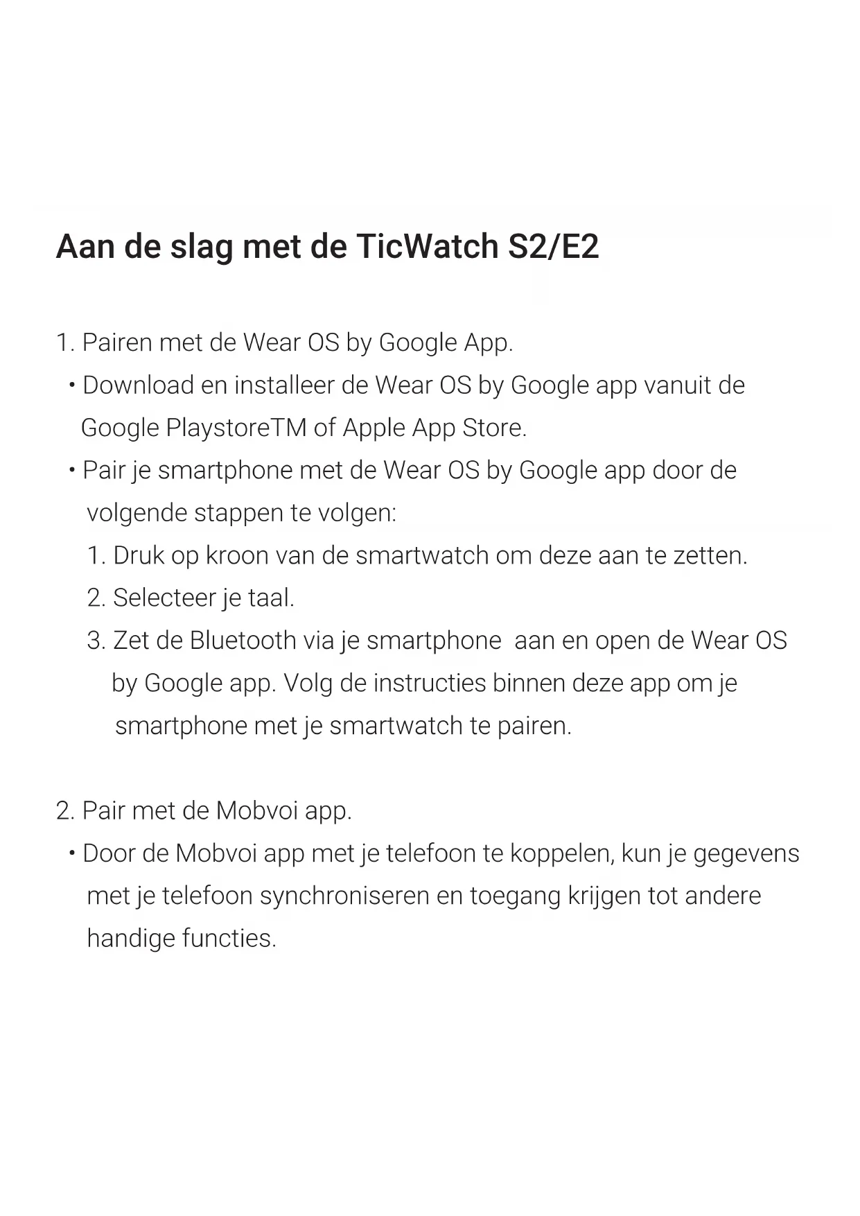 - Door de Mobvoi app met je telefoon te koppelen, kun je gegevens met je telefoon synchroniseren en toegang krijgen tot andere handige functies.Aan de slag met de TicWatch S2/E2