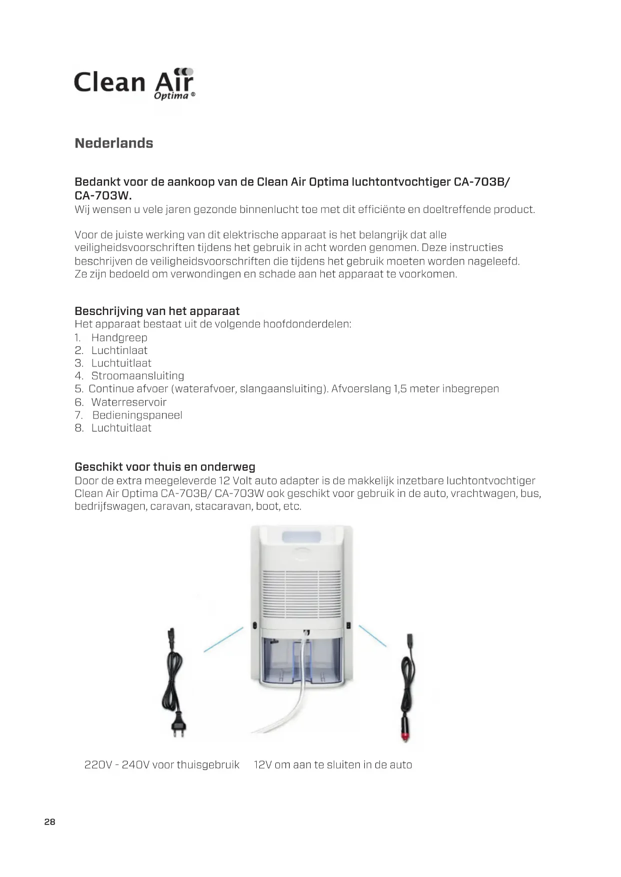 Bedankt voor de aankoop van de Clean Air Optima luchtontvochtiger CA-703B/CA-703W.