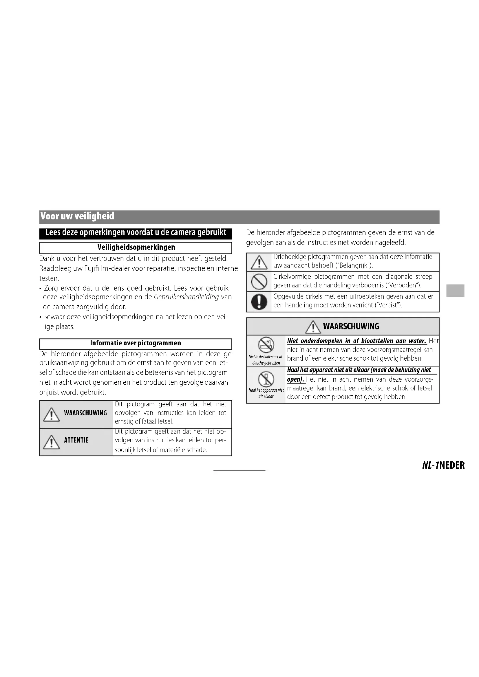 ATTENTIE ATTENTIE Houd buiten het bereik van kleine kinderen. In de handen van kinderen kan dit product letsel veroorzaken. Hanteer niet met natte handen. Het niet in acht nemen van deze voorzorgsmaatregel kan een elektrische schok tot gevolg hebben. Houd de zon uit het beeld bij het fotograferen van onder- werpen met tegenlicht. Zonlicht dat wordt scherpge- steld in de camera wanneer de zon zich in het beeld of vlakbij het beeld bevindt, kan brand of brandwonden veroorzaken. Wanneer het product niet in gebruik is, plaats de lensdop- pen terug en bewaar niet in direct zonlicht. Zonlicht dat wordt scherpgesteld door de lens kan brand of brand- wonden tot gevolg hebben. Draag de camera of lens niet terwijl deze op een statief is bevestigd. Het product kan vallen of andere voorwer- pen raken, wat letsel tot gevolg kan hebben.NL-3NEDERLANDS Inleveren van elektrische en elektronische apparatuur in particuliere Inleveren van elektrische en elektronische apparatuur in particuliere huishoudens huishoudens In de Europese Unie, Noorwegen, IJsland en Liechtenstein: Dit symbool op het product of in de handleiding en in de garantievoorwaarden en/ of op de verpakking duidt aan dat dit product niet als huishoudelijk afval mag worden beschouwd. In plaats daarvan moet het apparaat bij een inzamelpunt voor recycling van elektrische en elektronische apparatuur worden ingeleverd. Door dit product op juiste wijze te verwijderen helpt u potentiële negatieve gevolgen voor het milieu en de gezondheid van de mens voorkomen. Onjuiste verwerking van dit product kan het milieu schaden. De recycling van materialen helpt bij het behoud van natuurlijke bronnen. Neem contact op met uw gemeente, uw inzamelpunt voor het inleveren van huishoudelijk afval of de winkel waar u het product hebt gekocht voor meer gedetailleerde informatie over recycling van dit product. In landen buiten de Europese Unie, Noorwegen, IJsland en Liechtenstein: Neem contact op met uw gemeente en vraag naar de juiste wijze waarop u dit product inclusief batterijen of accu’s dient te verwijderen.NL-4 NEDERLANDS Voordat u dit product gebruikt De lens werkt mogelijk niet zoals verwacht, en sommige functies zijn mogelijk niet beschikbaar bij oudere versies van de camera rmware. Zorg ervoor dat u de camera rmware bijwerkt naar de laatste versie. Instructies voor het bekijken van de camera rmware-versie en het updaten van ca- mera rmware zijn beschikbaar op de volgende websites: http://www.fujifilm.com/support/digital_cameras/ software/#firmware Als u geen toegang hebt tot een computer, is on- dersteuning mogelijk via de plaatselijke verdeler vermeld in de “FUJIFILM Worldwide Network”- data die met uw camera wordt meegeleverd. Productverzorging